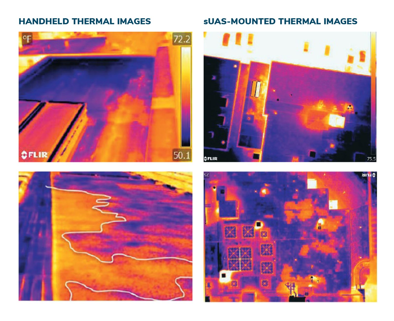 Quality of Data, Ease of Analysis: The quality of data and deliverables provided by an sUAS infrared scan is generally superior to what handheld infrared camera scans produce. Capturing larger areas of the roof in individual or stitched images allows design professionals to see a holistic infrared view of the roof that can be easily analyzed to identify larger patterns, which are more difficult to discern when reviewing many individual images.