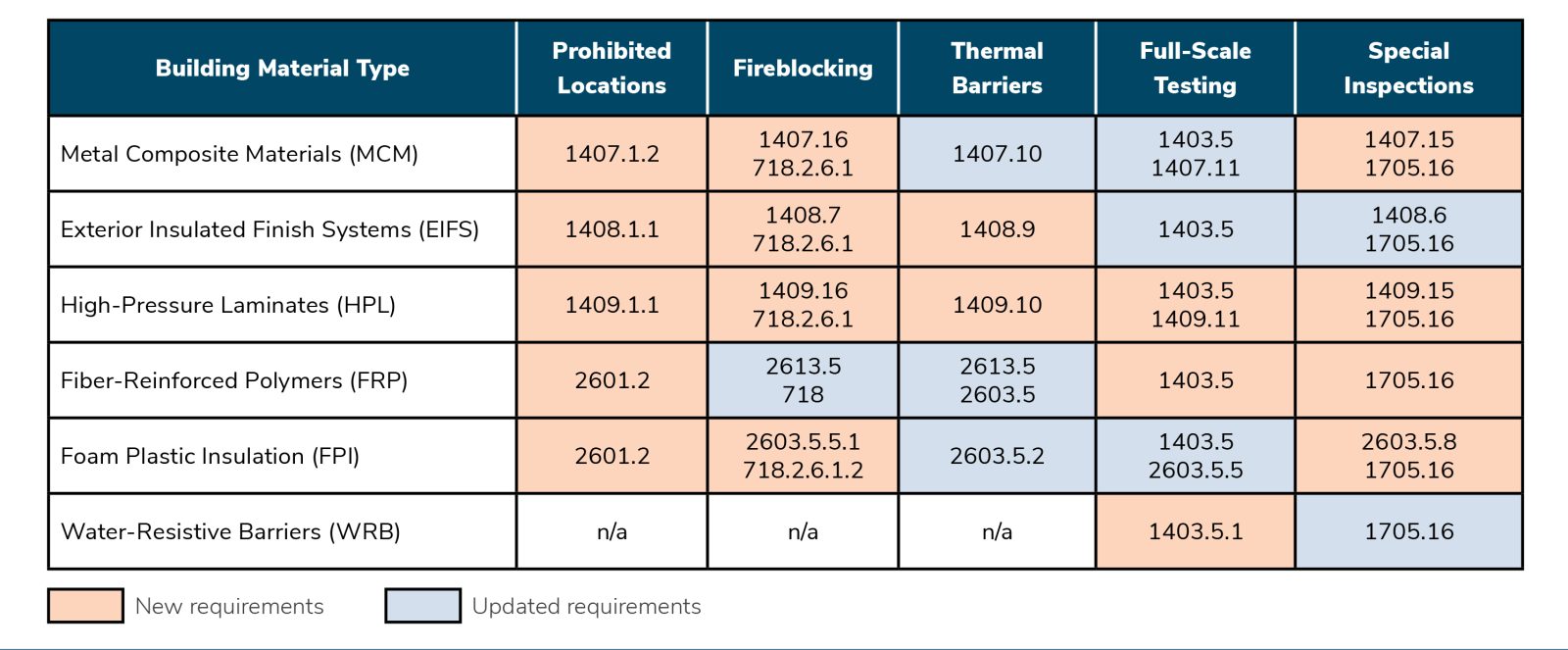 New special inspection requirements include verifying compliance with approved NFPA 285 test reports; fireblocking materials, installation, and location; and water-resistive barrier (WRB) and thermal barrier installation.