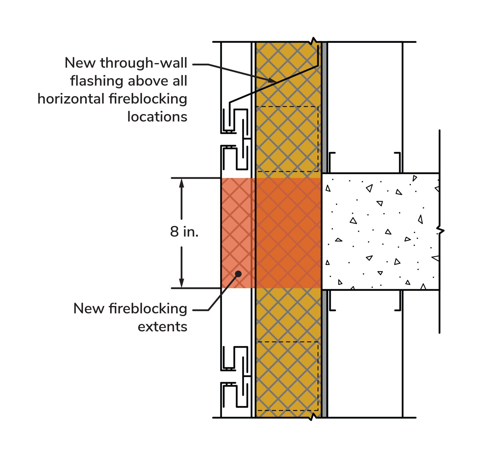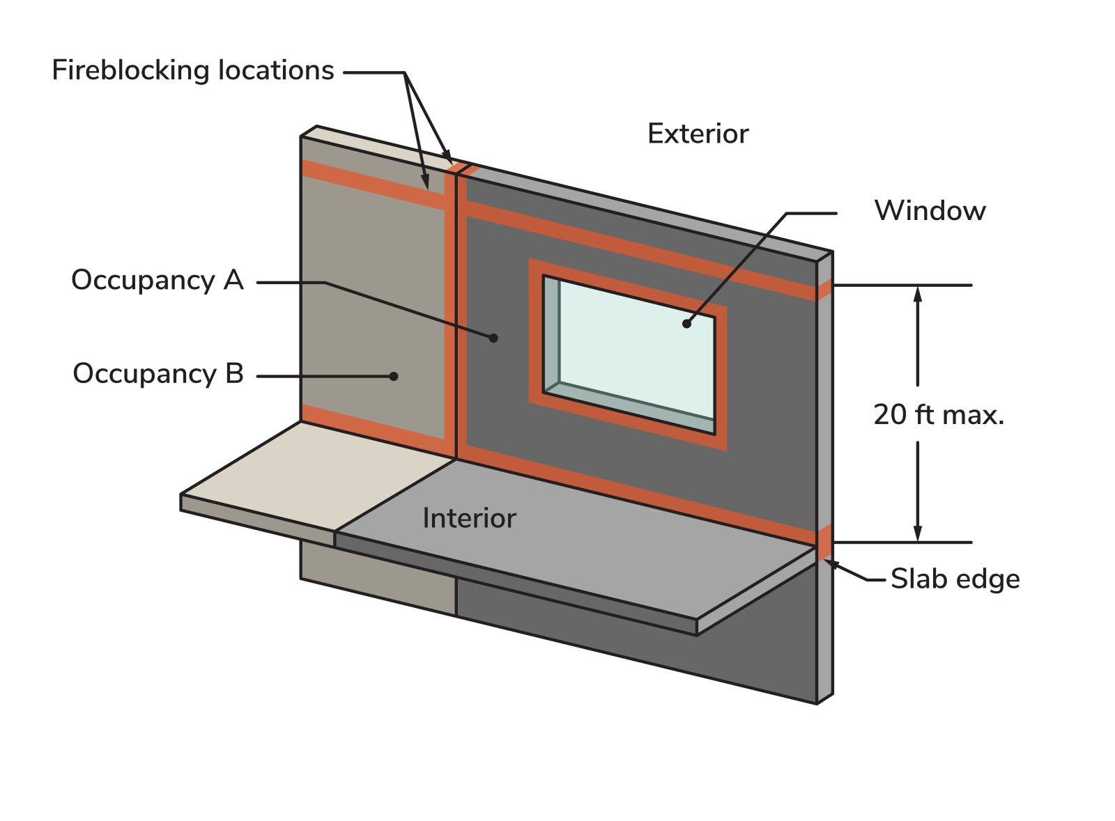 For some combustible materials, fireblocking is also required at both vertical and horizontal edges at 20 ft-maximum distances to form 100 sq-ft-maximum compartments. There are also additional fireblocking requirements for retrofitting non-sprinklered buildings over 75 ft.
