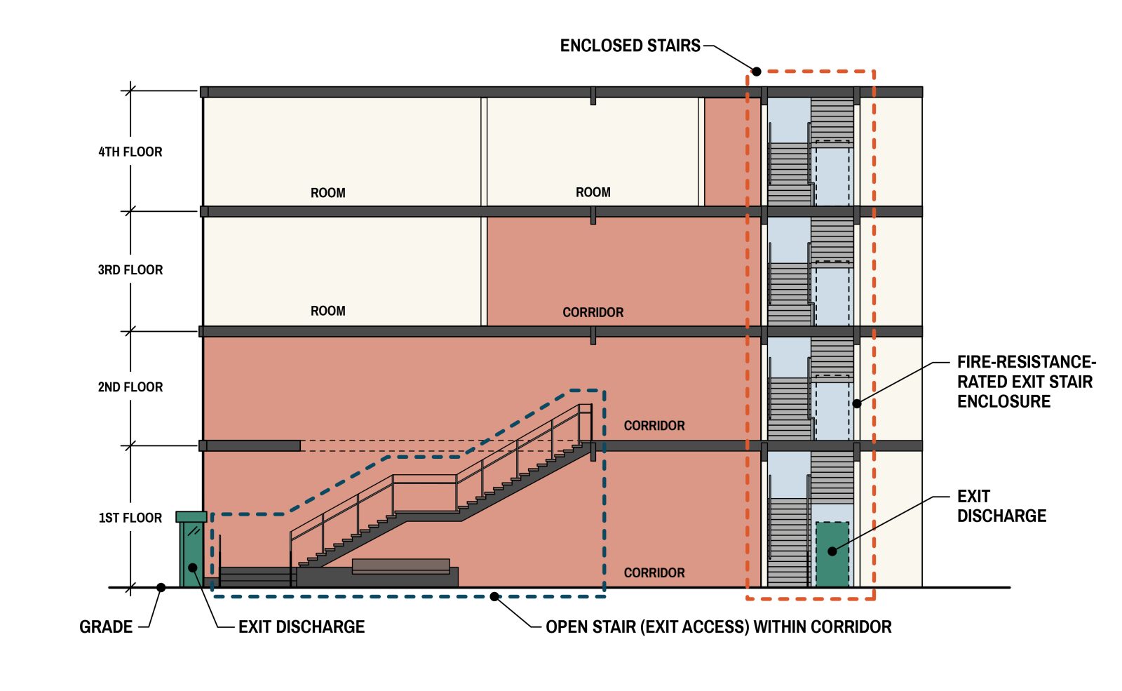 Within a building, stairs can be used as exit stairs or exit access stairs. An exit access stair is an unprotected stair that connects two stories. Although this stair can be used for convenience to allow occupants to communicate between stories, it cannot be used as an exit stair. If occupants travel up or down an exit access stair, an exit access travel distance measurement must be counted along the exit access stair. Exit access travel distance can terminate when occupants reach an exit, such as a protected exit stair.