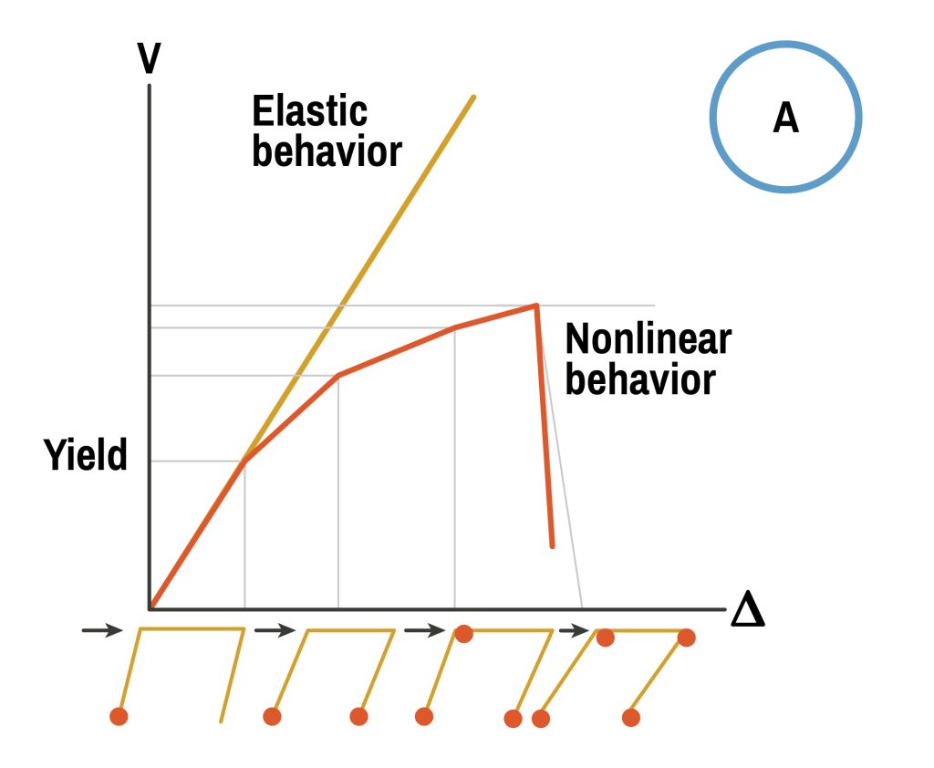 The word “ductile” or “ductility” is used by engineers to describe a material’s ability to undergo large deformations without breaking. Think of a new rubber band’s ability to stretch considerably longer than its original length without snapping. The ability of a building to “stretch” without breaking is an advantageous quality that is purposely planned for by modern structural engineers who design buildings and other structures in high-seismic regions. A “brittle” material is the opposite, and this quality can have negative consequences when it is subject to stretching. Think of an old, dried-out rubber band that snaps almost immediately upon stretching. Our current understanding of how buildings behave and perform during an earthquake took many years to develop, and our building codes did not holistically consider a building’s ability to stretch until 1976.