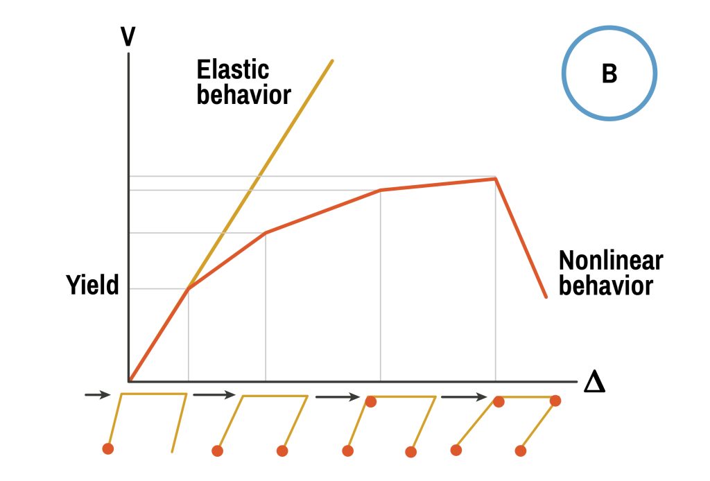 Comparison of non-ductile (A) with ductile (B) structural behavior.