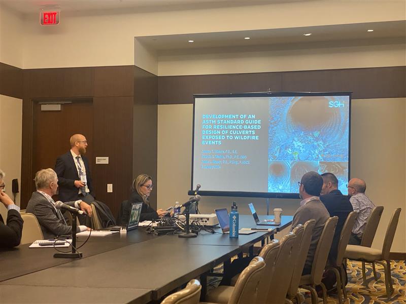 - Jeremy also delivered a presentation during the AKB70 committee meeting, “Development of an ASTM Standard Guide for Resilience-Based Design of Culverts Exposed to Wildfire Events,” with contributions from Jesse.