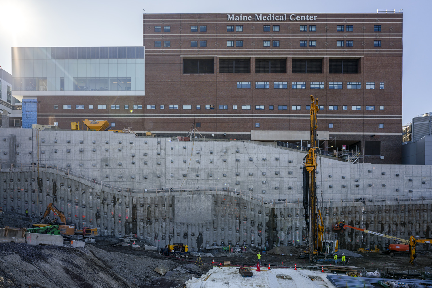 As the Coulombe Family Tower project drew to a close, MaineHealth sought to increase MHMMC’s number of beds and create a more thoughtful campus perimeter by demolishing a 1970s parking garage, which had exceeded its useful life, and replacing it with a new flagship entrance and clinical wing. The site for the Malone Family Tower is bounded on all four sides and integrated with other hospital buildings and critical infrastructure, making it a challenging site to work in. Despite this, the location was important to help elevate the hospital’s visual presence and make it more accessible from Congress Street. The project required excavating an additional 40 ft below the bottom of the existing garage to final grade, creating space for the tower and a new gateway to campus from Congress Street. SGH provided multidisciplinary services, including geotechnical, structural, and building enclosure engineering for the project.