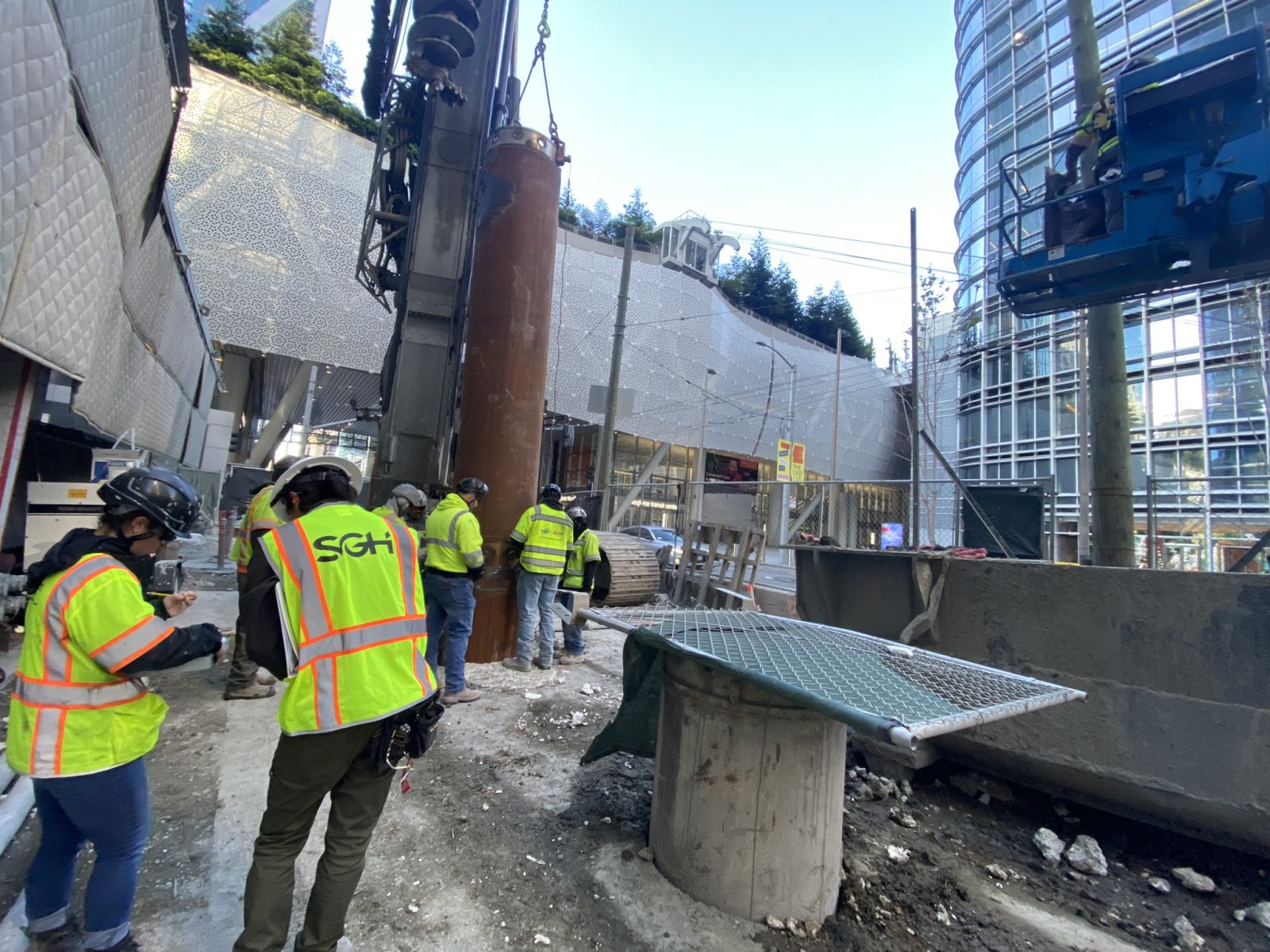 SGH used Load and Resistance Factor Design foundation design procedures, newly implemented in the ASCE 7 standard, to demonstrate there was a less costly solution. Mediators brokered a settlement based on an alternate foundation upgrade option comprising fifty-two piles, drilled to rock, along the north and west perimeters with approximately 18% of the building’s 200,000 kip weight jacked onto the new piles. The retrofit was intended to arrest settlement along the north and west sides while allowing gradual tilt recovery through settlement across the balance of the building footprint. Recognizing that settlement might continue, our design incorporated structural fuses into the load transfer path between the new 24 in. piles and existing building foundation to protect the existing foundation from overload and failure. A double-cased, drilled, cast-in-place pile design and friction-reducing coatings on the casings helped to minimize load transfer from the new piles into surrounding soils above the rock.
