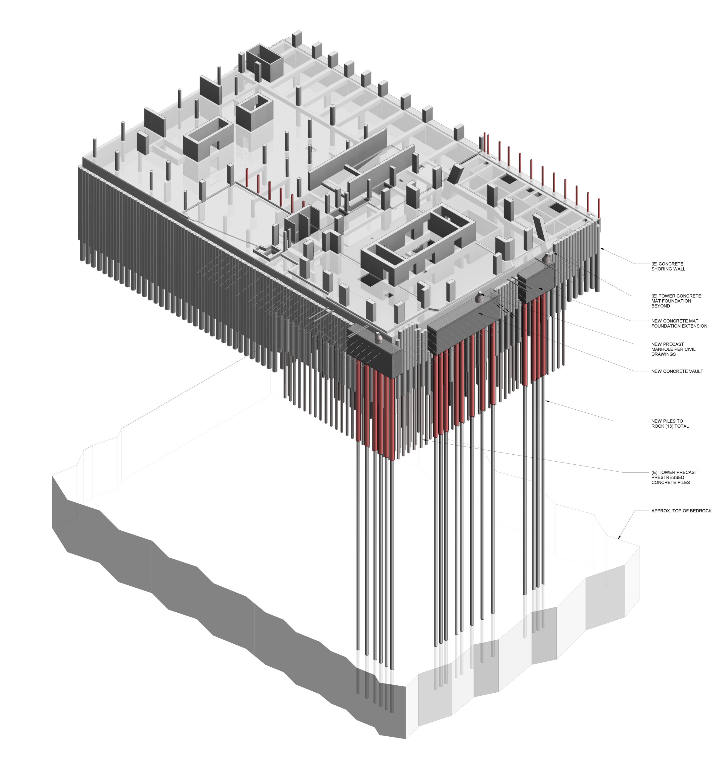 SGH used Load and Resistance Factor Design foundation design procedures, newly implemented in the ASCE 7 standard, to demonstrate there was a less costly solution. Mediators brokered a settlement based on an alternate foundation upgrade option comprising fifty-two piles, drilled to rock, along the north and west perimeters with approximately 18% of the building’s 200,000 kip weight jacked onto the new piles. The retrofit was intended to arrest settlement along the north and west sides while allowing gradual tilt recovery through settlement across the balance of the building footprint. Recognizing that settlement might continue, our design incorporated structural fuses into the load transfer path between the new 24 in. piles and existing building foundation to protect the existing foundation from overload and failure. A double-cased, drilled, cast-in-place pile design and friction-reducing coatings on the casings helped to minimize load transfer from the new piles into surrounding soils above the rock.