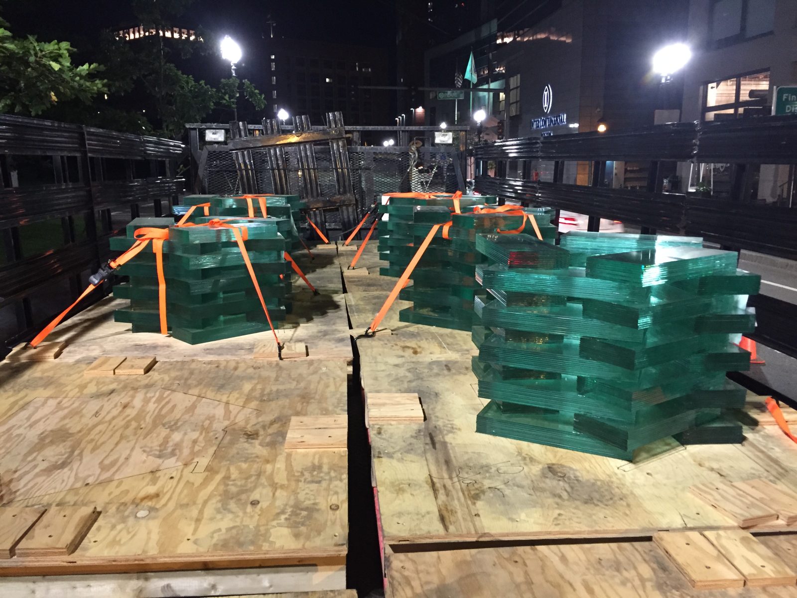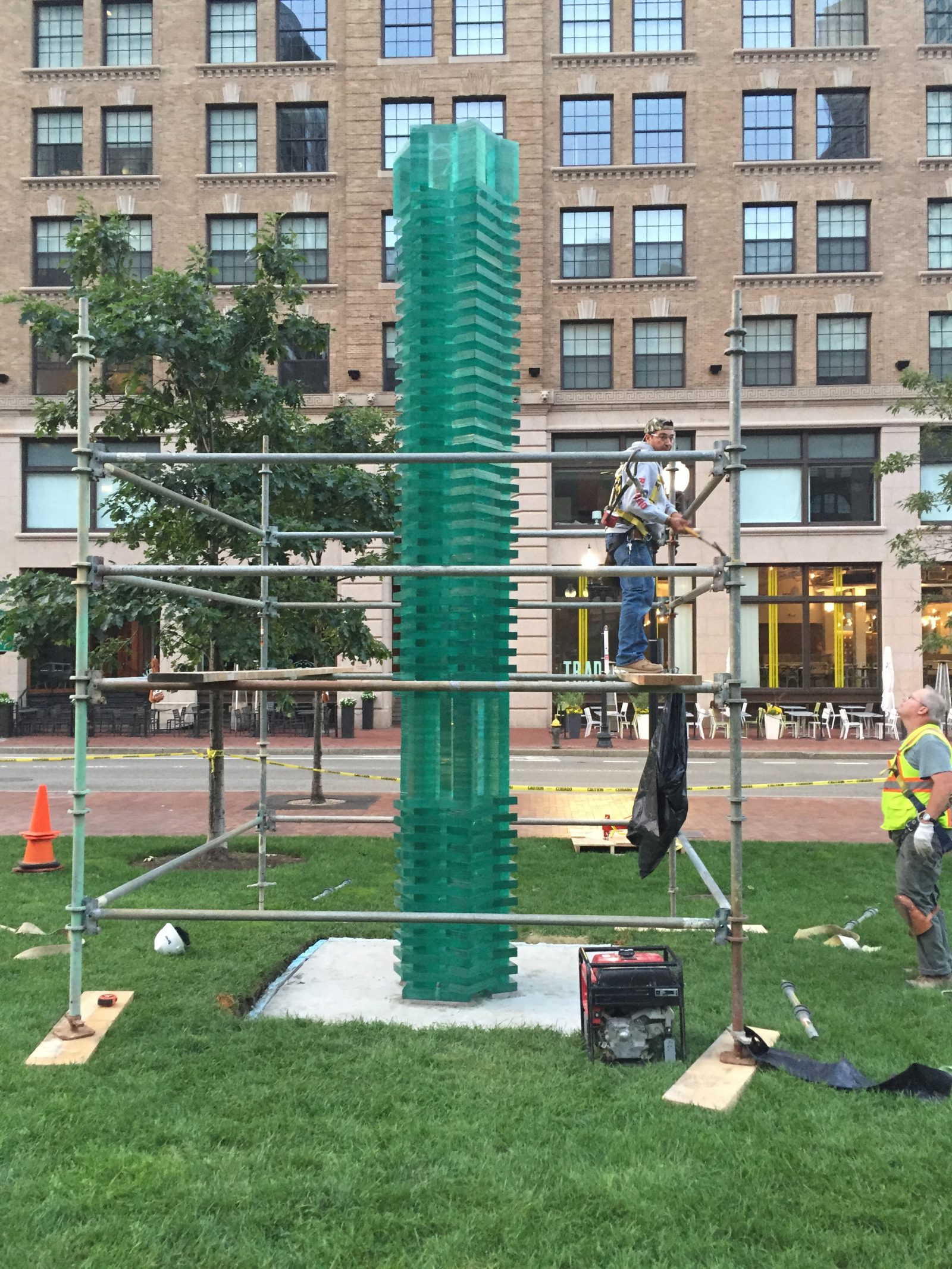 The construction team of Turner Construction Company and Karas & Karas Glass Company fabricated each block by adhering ten glass pieces and then stacked the blocks to form modular parts of the sculpture. The team transported the ten modules to site and hoisted them into position between the hours of 2:00 a.m. and 6:00 a.m. on 12 July 2015. By constructing The Tower at night, the team could control the on-site application of adhesive using electric ultraviolet lights to prevent premature curing under sunlight.