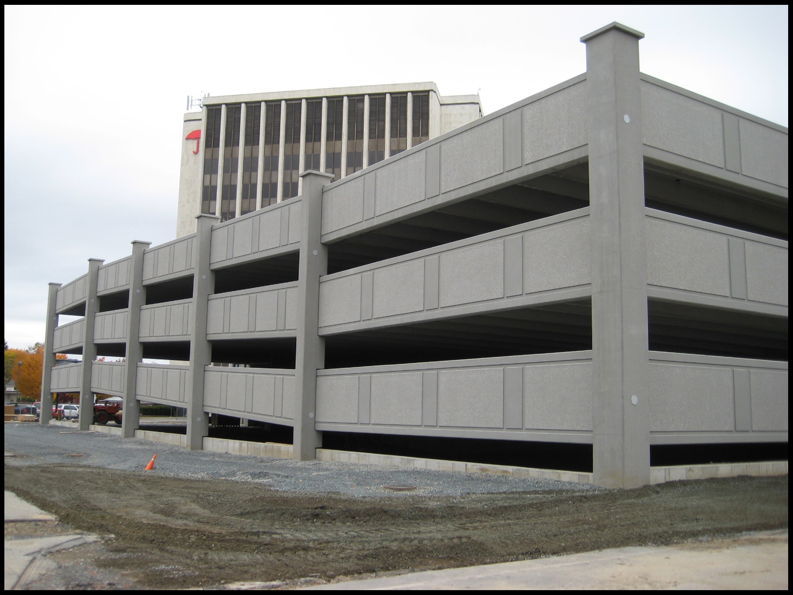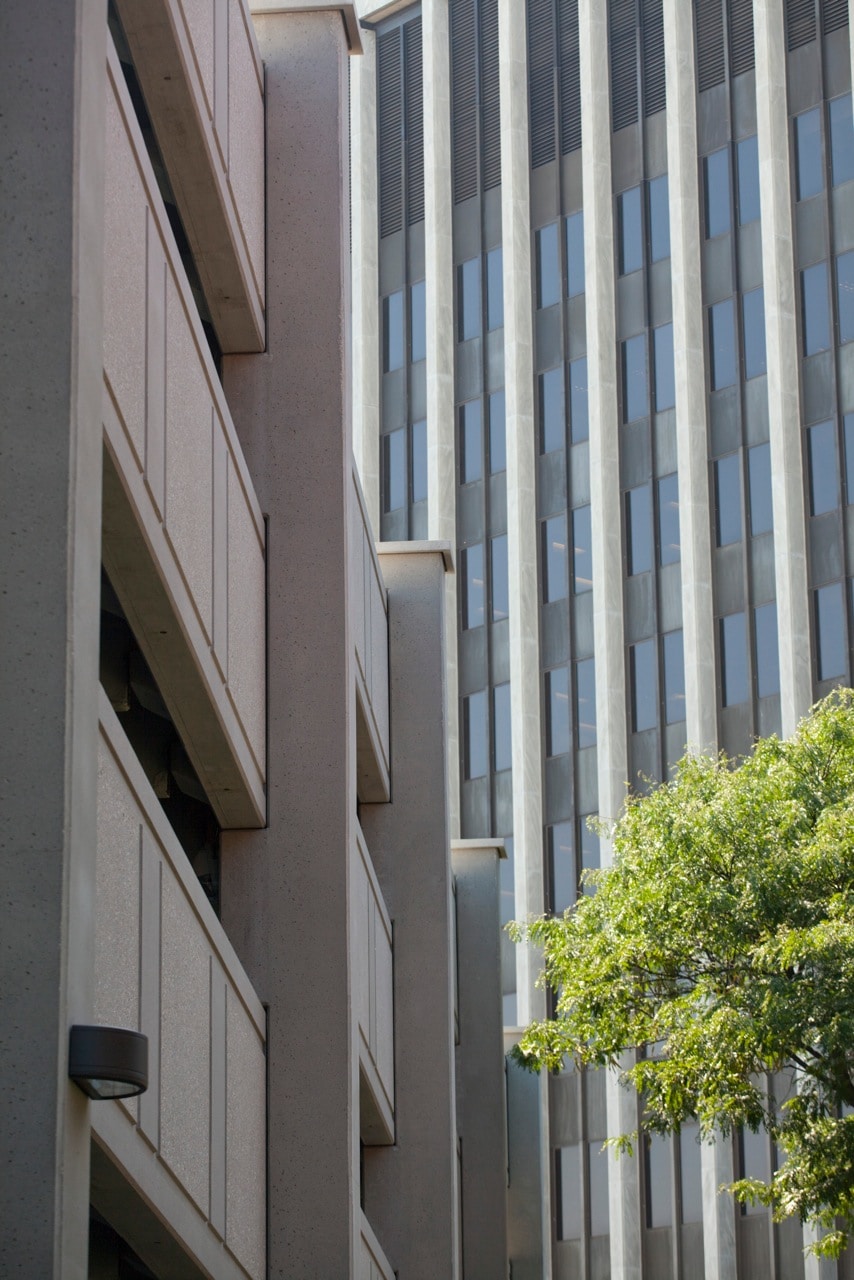 The new garage with a ground level and three elevated levels contains an enclosed stair/elevator tower and an open stair tower. We designed the precast concrete superstructure supported on cast-in-place concrete spread footings to accommodate a two-level future vertical expansion.