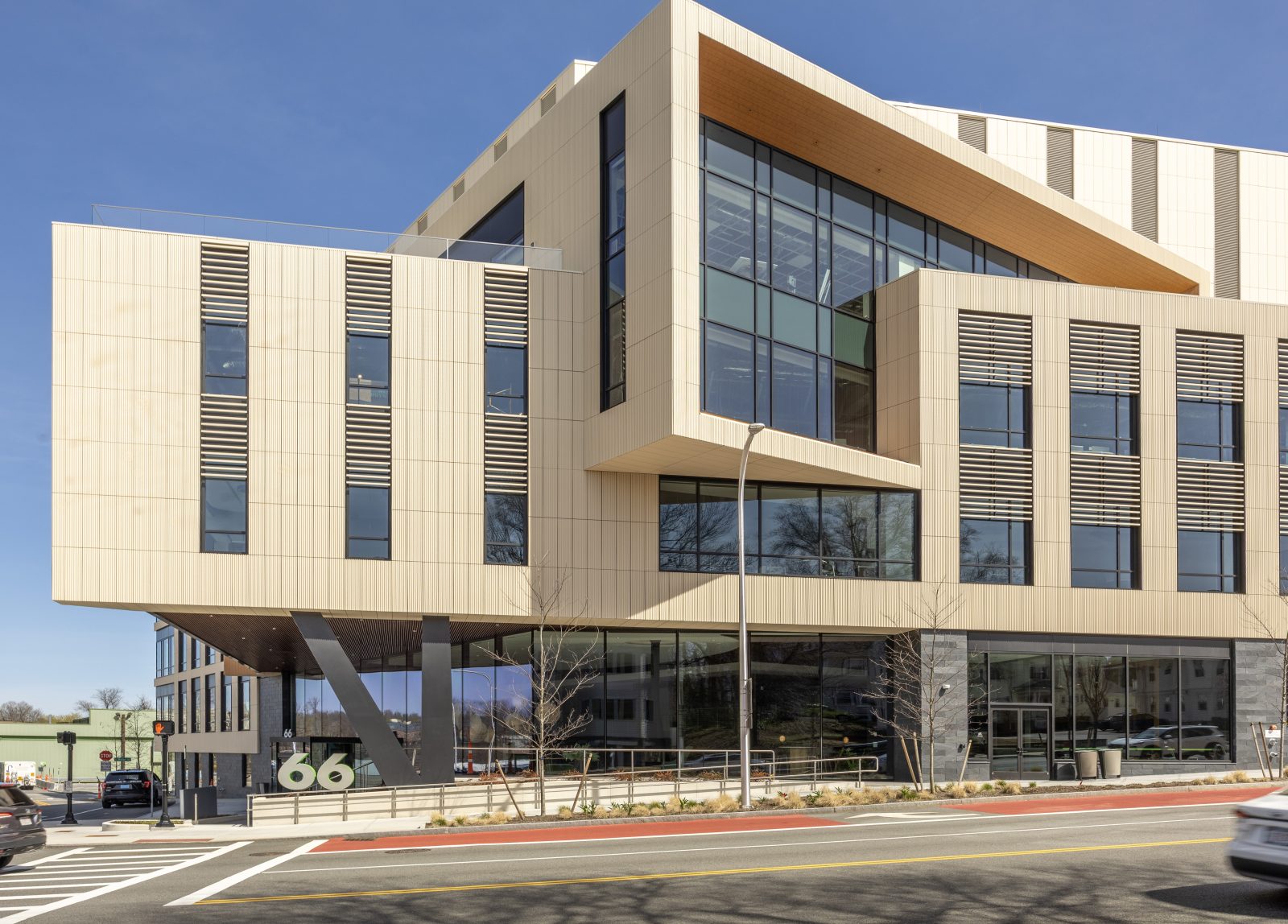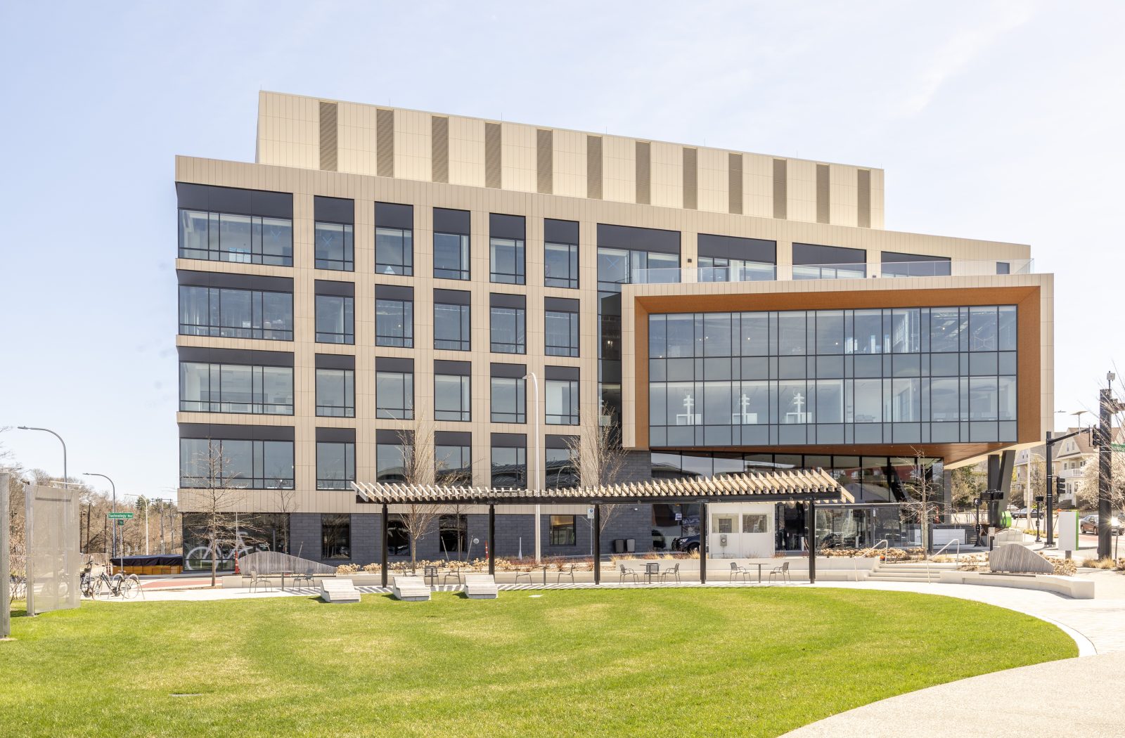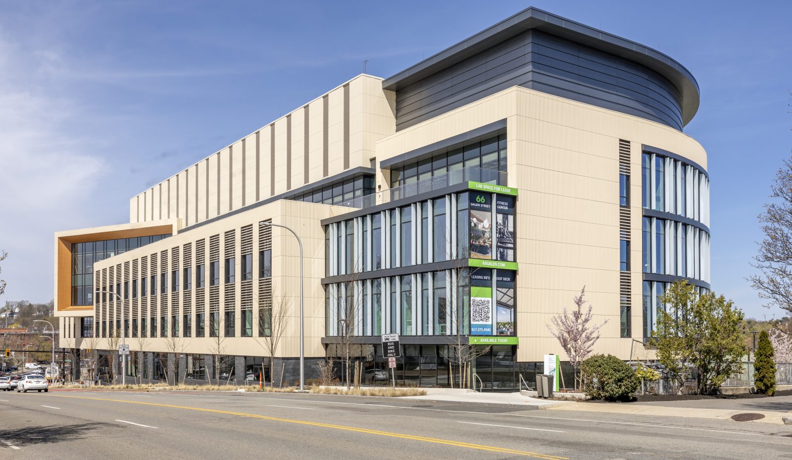Located on a five-acre campus along the Charles River, the building at 66 Galen street is purpose-built for life science tenants with four levels of leasable modern office and laboratory space, and below-grade parking. The building offers amenities and spaces for collaboration, such as a tiered outdoor park, rooftop terrace, and lobby lounge. SGH consulted on building enclosure design for the building, featuring a variety of facade systems, including a curved curtain wall along the river-facing elevation, a green-roof terrace, and a membrane roof covered with a photovoltaic array.