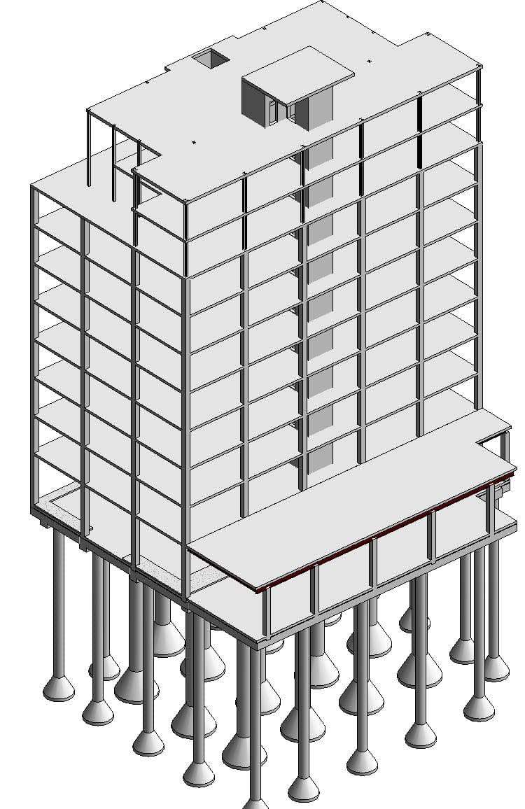 - Designing transfer girders at Level 9 to support a two-story, set-back penthouse structure and at Level 2 to span drive lanes and parking below