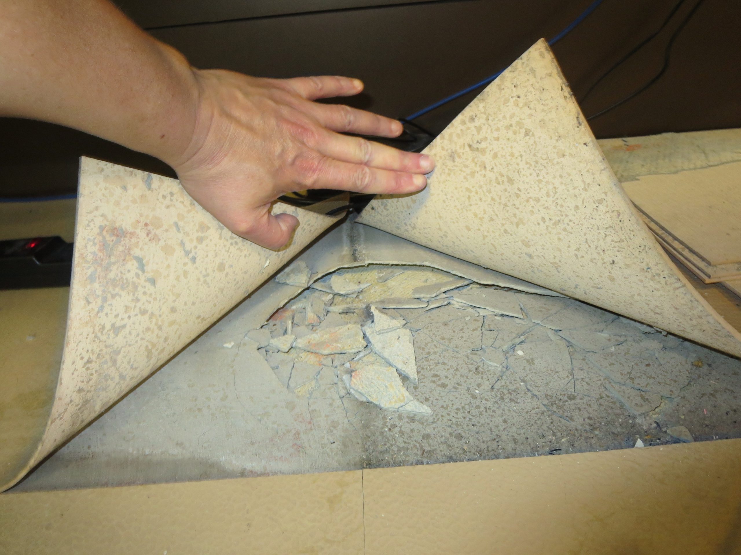 SGH observed adhesive from a previous carpet installation remaining between the new underlayment and the concrete slab. The underlayment did not bond to this adhesive, leading to bubbles and wrinkles in the flooring. We also concluded the floor tiles lack a continuous application of adhesive and are poorly bonded.
