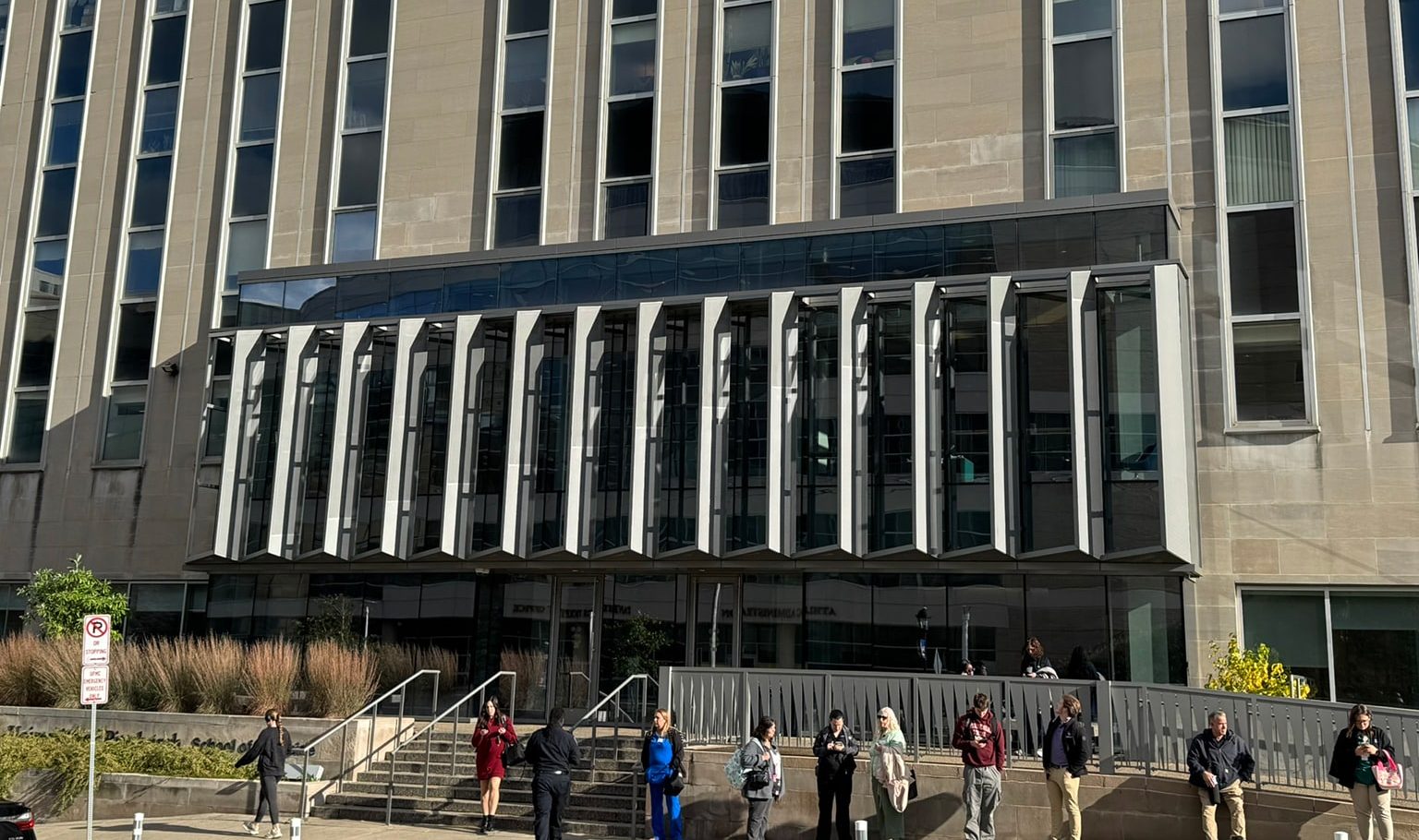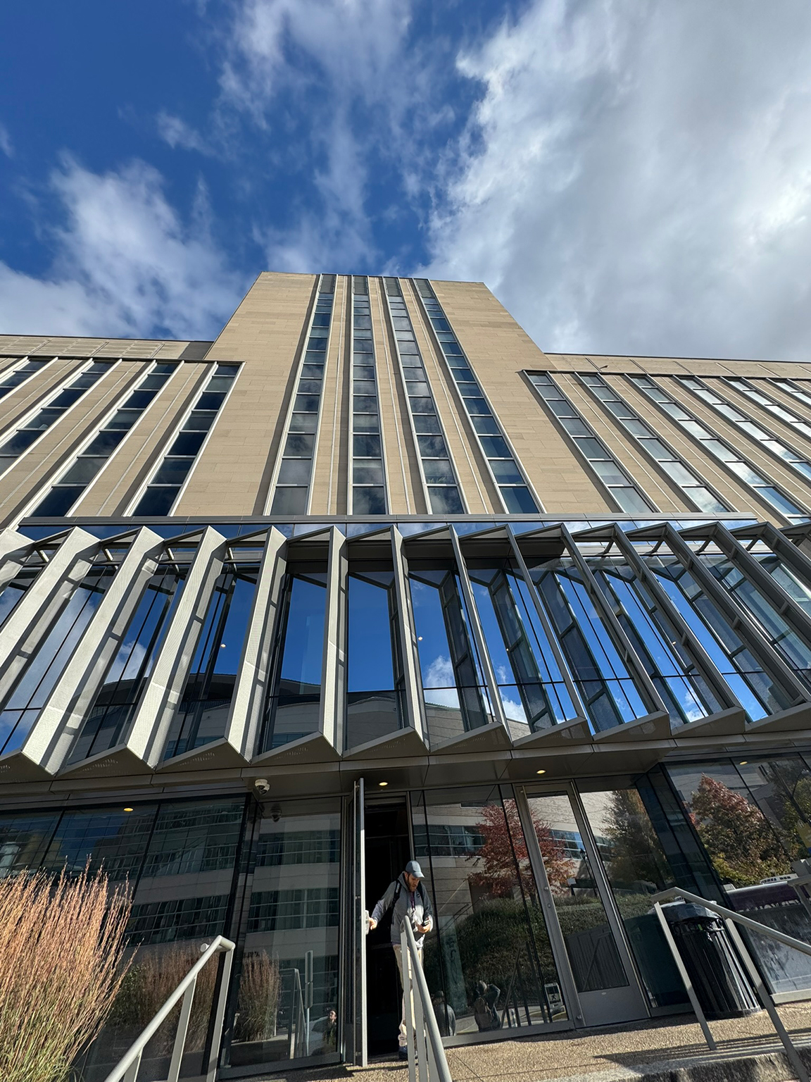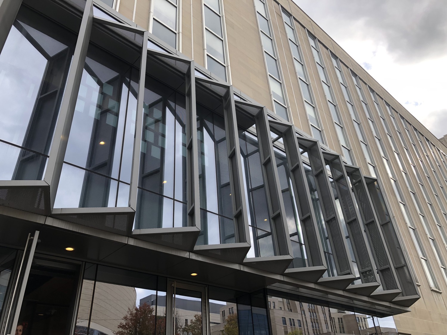 - A glass-enclosed café cantilevering over the original entrance with perforated aluminum sun shades