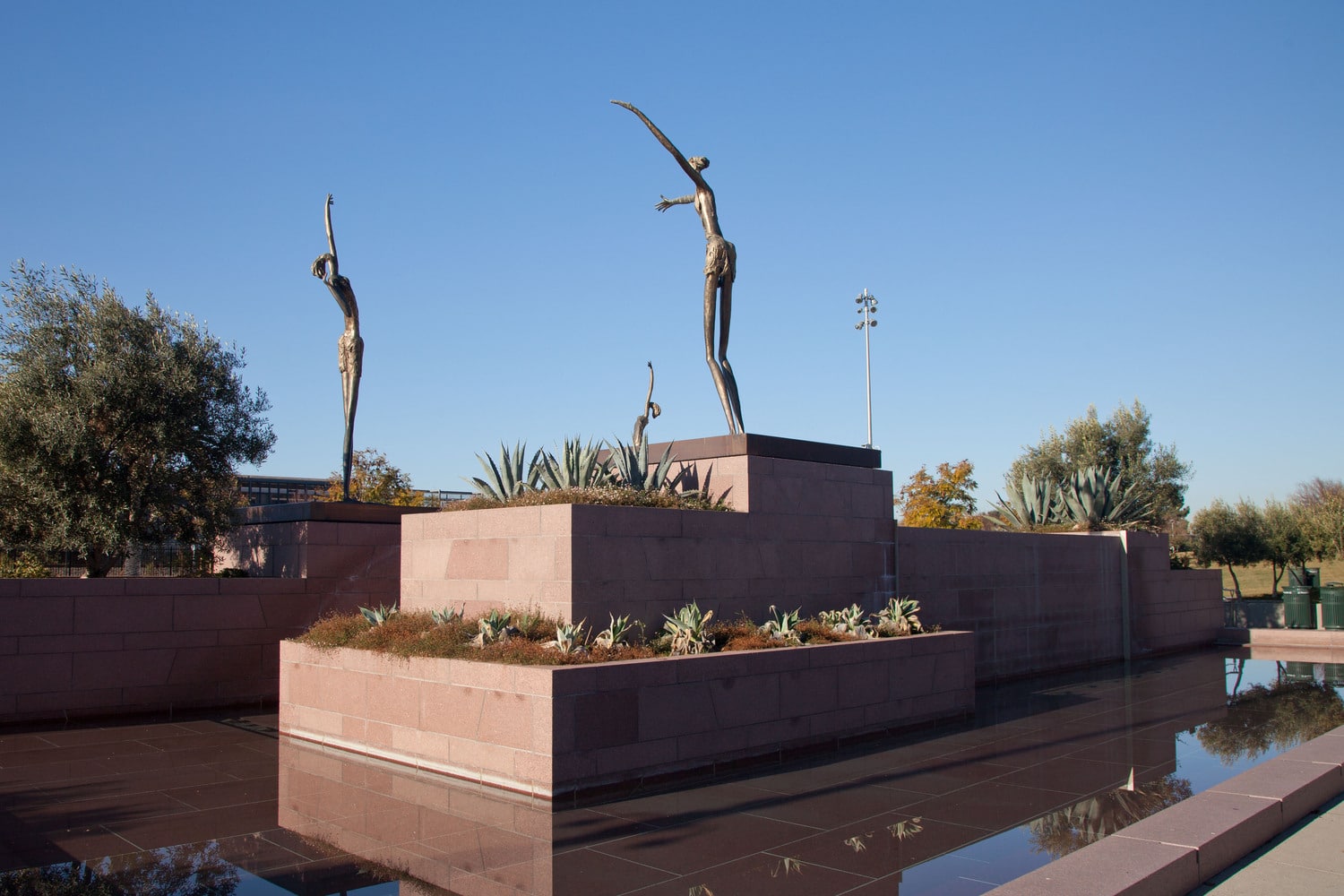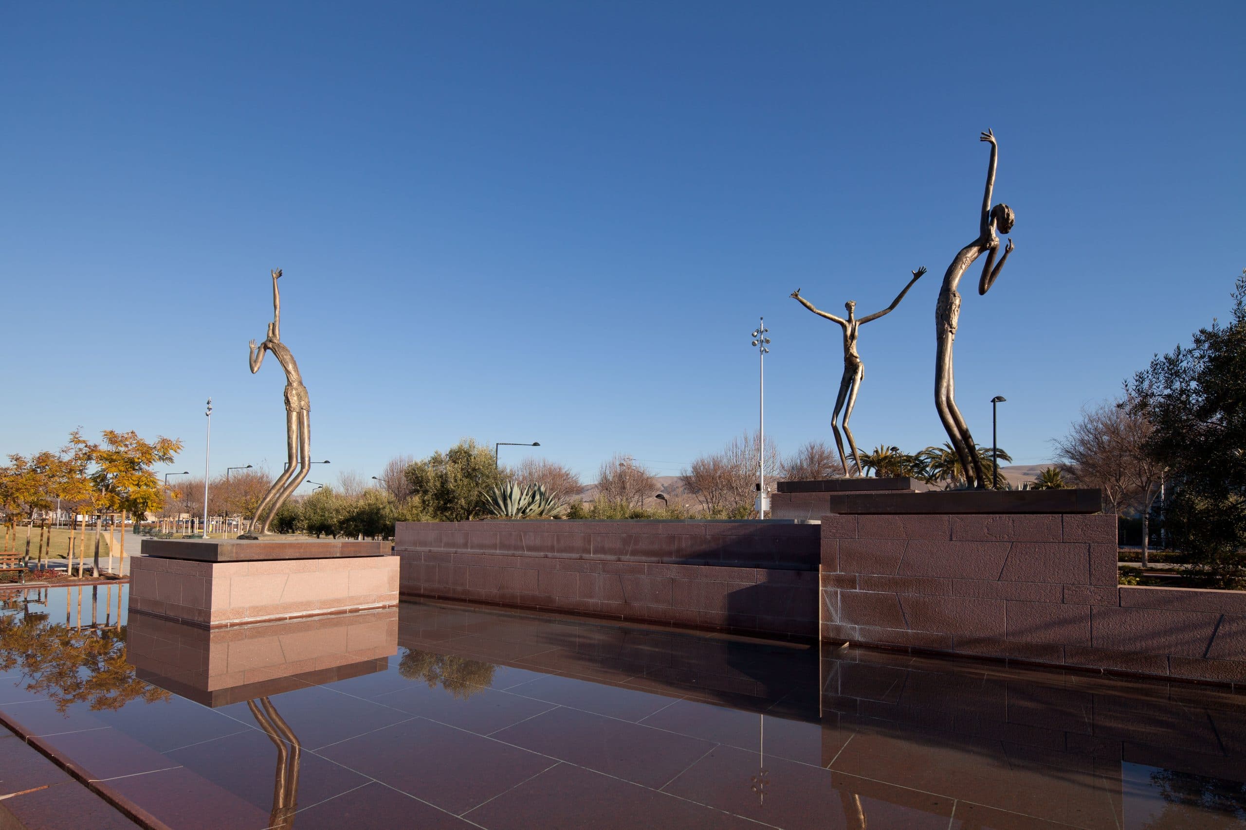 Union City sought to develop a civic plaza with a featured centerpiece and commissioned a terraced fountain with three bronze Danseurs on platforms positioned within the fountain. With the fountain located only 0.6 mi northeast from the Hayward fault line, SGH suggested mounting the 16 ft tall, 1800 kg statues on base-isolated platforms to limit damage during a design earthquake.