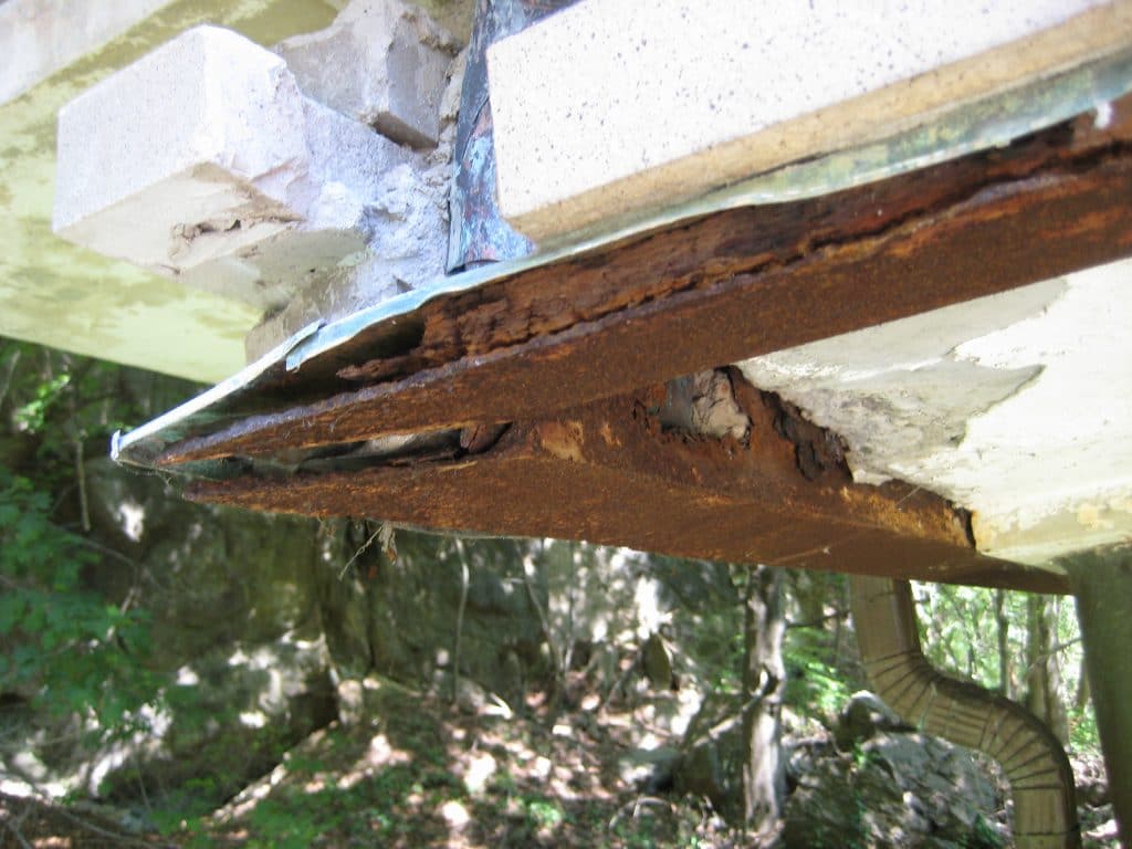 - Identified areas of significant corrosion of reinforcement, support angles, and masonry ties causing masonry deterioration and concrete spalling at the original building
