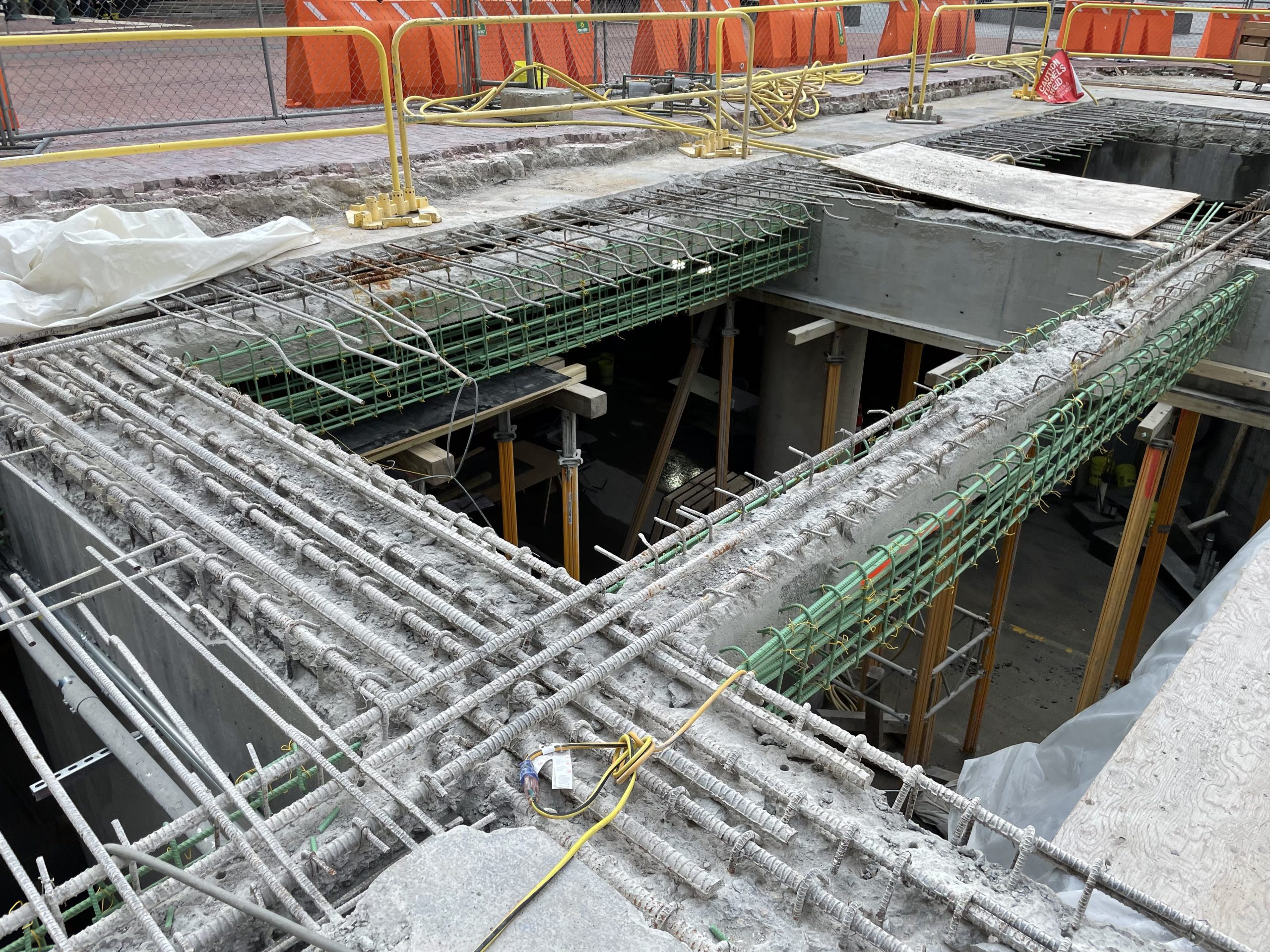 - Civic Pavilion. SGH is the structural engineer of record for the new 3,300 sq ft building that houses pumping equipment for the plaza’s water features and a function room with bathrooms for the public. The building includes a green roof with landscaping and hardscaping that blend with on-grade portions of the renovated plaza. The pavilion uses two 18-ft-deep concrete girders that cantilever over the existing MBTA subway tunnel. SGH collaborated with the construction team to avoid overloading the tunnel structure and develop innovative concrete placement sequences with supplemental reinforcement that allowed the first partial-height placement to function as shoring for the heavier second placement.