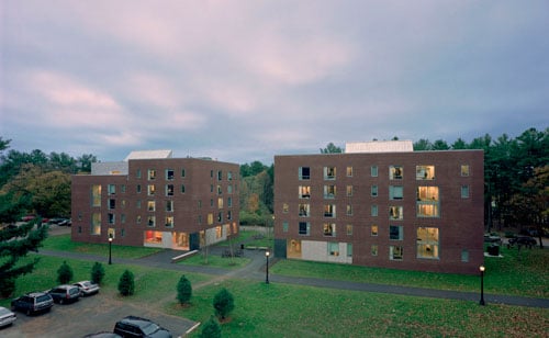 To accommodate the increasing student population, Bowdoin College sought to build two new freshmen dormitory buildings. The brick-clad dorms provide rooms for 160 students and offer common lounge space in generous hallways. The buildings feature several sustainable building enclosure features, including large windows and skylights to provide natural daylighting and white roofs to reflect sunlight and minimize cooling during hot weather. SGH provided building enclosure consulting and construction administration services for the project.
