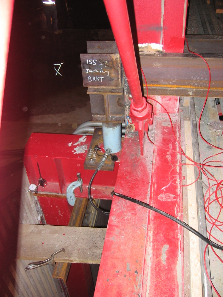 SGH monitored movements between the support frame and the bottom chord of the truss using dial gauges. We also installed strain gauges to monitor the changes in stress in the primary truss members during jacking.