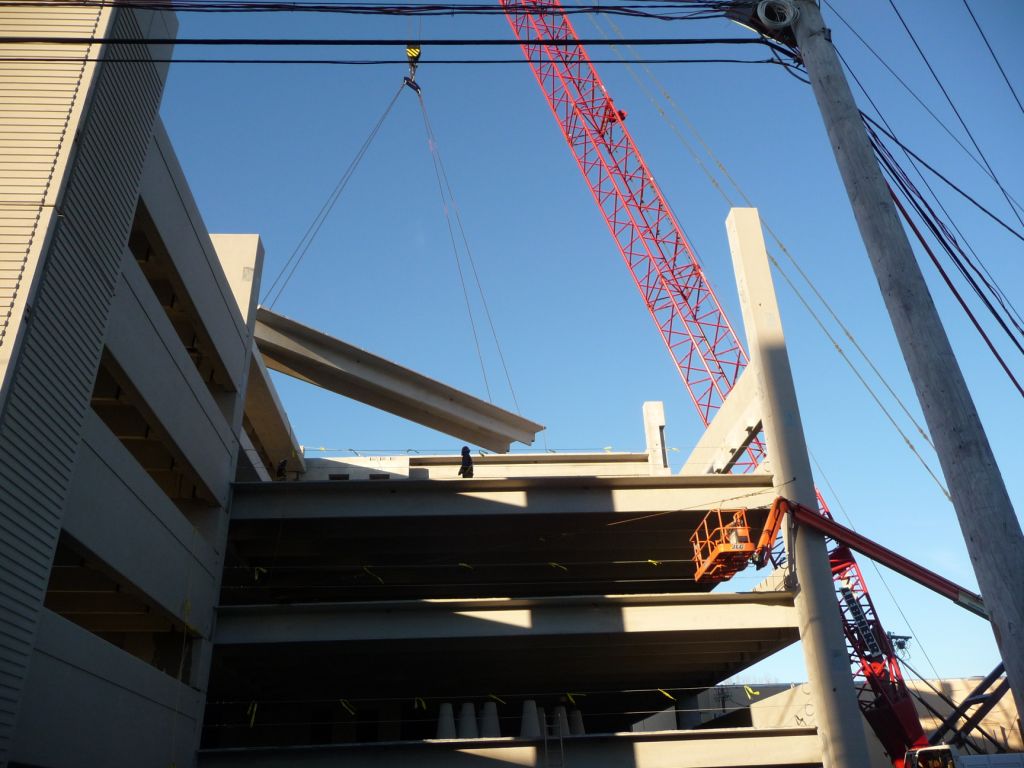 We were also the engineer of record for the 660-car garage that has a precast concrete superstructure and a structural steel stair tower. Both bear on steel piles.