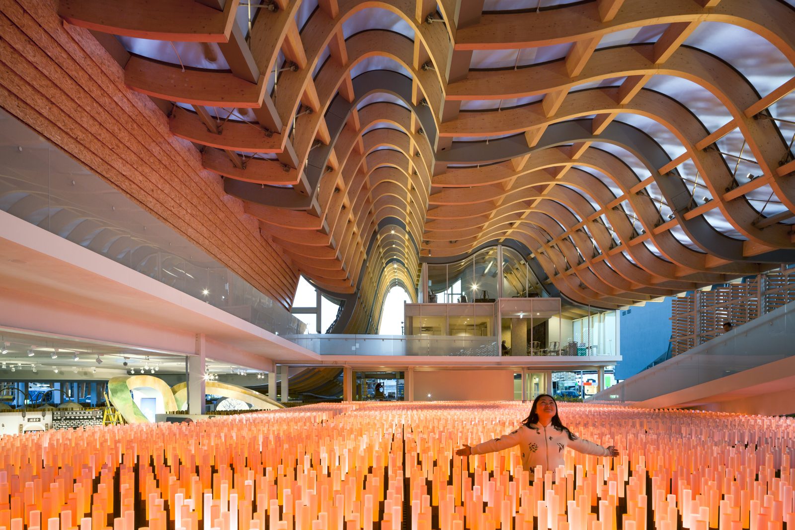 To accomplish long spans and cantilevers, complex geometry, continually varying elevations, and visual exposure of the structure, SGH selected glue-laminated timber (glulam) for the primary rafters based on its strength and stiffness, geometric flexibility, and aesthetics. The rafters, spaced at 2 m o.c., are each different in overall shape to form the desired roof profile. By discreetly locating columns where interior walls or slabs were close to the roof structure, SGH was able to accentuate the architect’s desire for minimal support and openness at the exhibition spaces. We also designed custom structural features, including steel-cable trusses “embedded” in the roof geometry, exposed glulam columns, and an interior steel and concrete structure that seems to grow from the field of LED lights appearing as wispy grains.