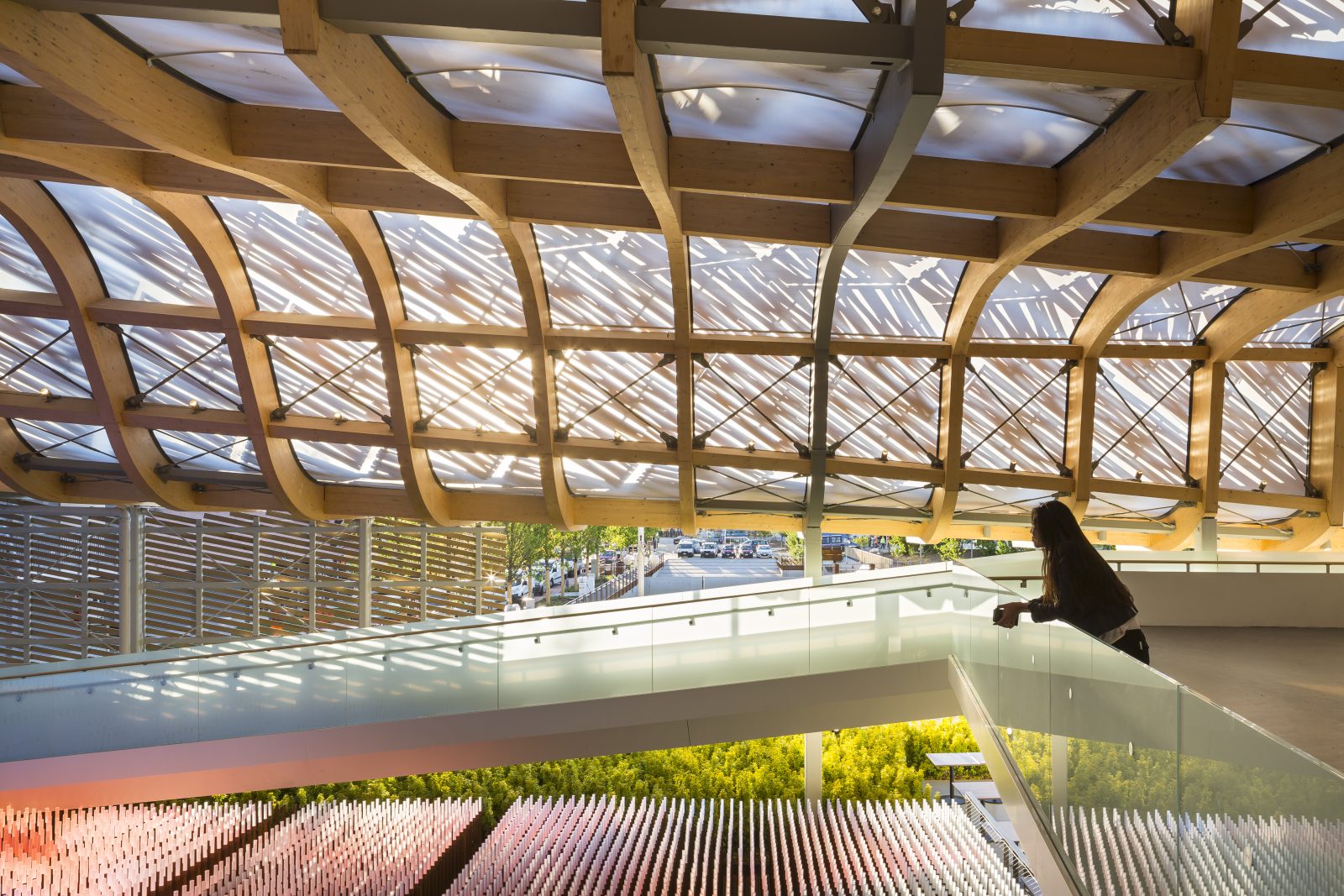 The architect specified a transparent roof enclosure to allow visitors to see the shingled bamboo sunscreens and the sky between the wood ribs of the roof. SGH investigated several clear materials, including glass, acrylic, polycarbonate, and ethylene tetrafluoroethylene (ETFE).