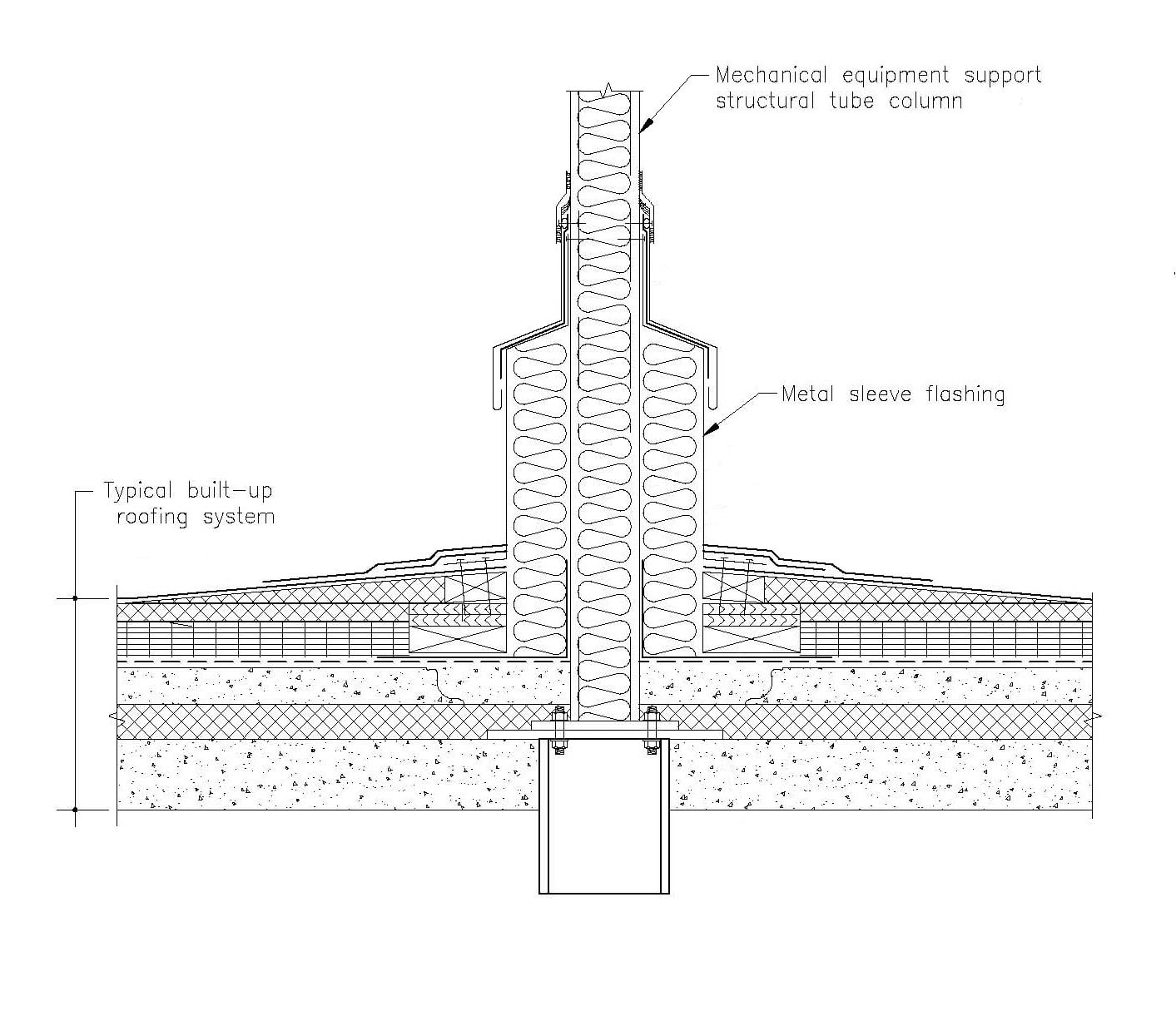 SGH performed other engineering tasks, including evaluating humidification in the library stacks, hygrothermal analysis of exterior duct work requiring insulation, and structural design services. We also conducted thermal analysis of structural steel members penetrating through the built-up roofing system (shown on right, second row), assessed the risk of condensation, and developed insulation flashing details.