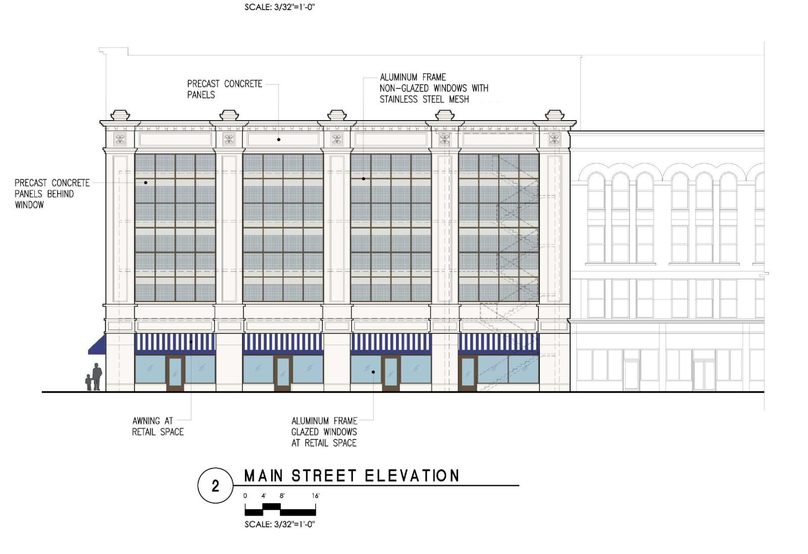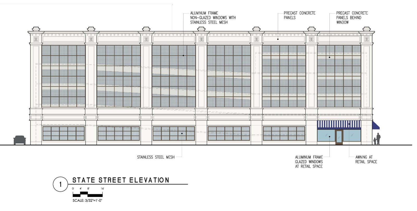 - Incorporated the use of an architectural precast concrete facade with stainless steel mesh