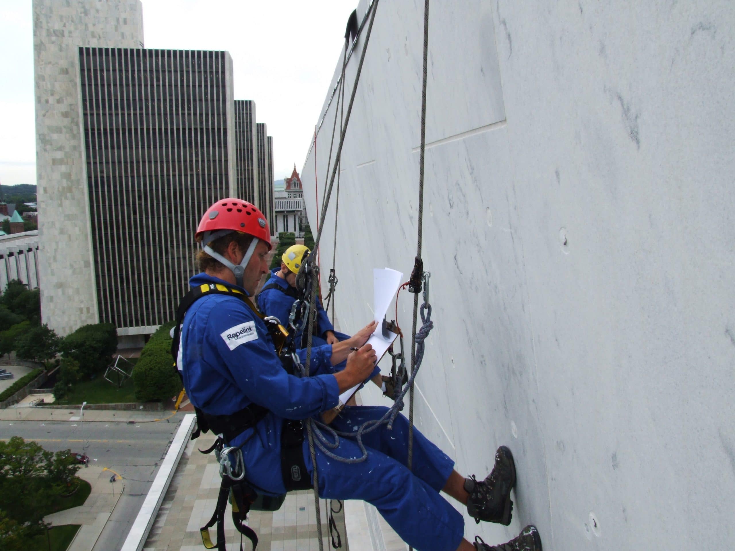 The eleven-story Cultural Education Center, constructed in 1961, is clad with Georgia Cherokee marble panels. The center houses the New York State Museum with a working, antique carousel for children, the state archives, and the state library. Beginning around 1974, OGS began addressing problems caused by marble panel anchorage defects and bowing. In 2006, OGS retained SGH to perform a hands-on evaluation, which included industrial rope access. We identified unsafe conditions and assisted OGS with limiting access to these areas. We then designed repairs for anchoring existing stones along with removing and temporarily replacing several stones with faux stone panels where stabilization anchors were impractical.