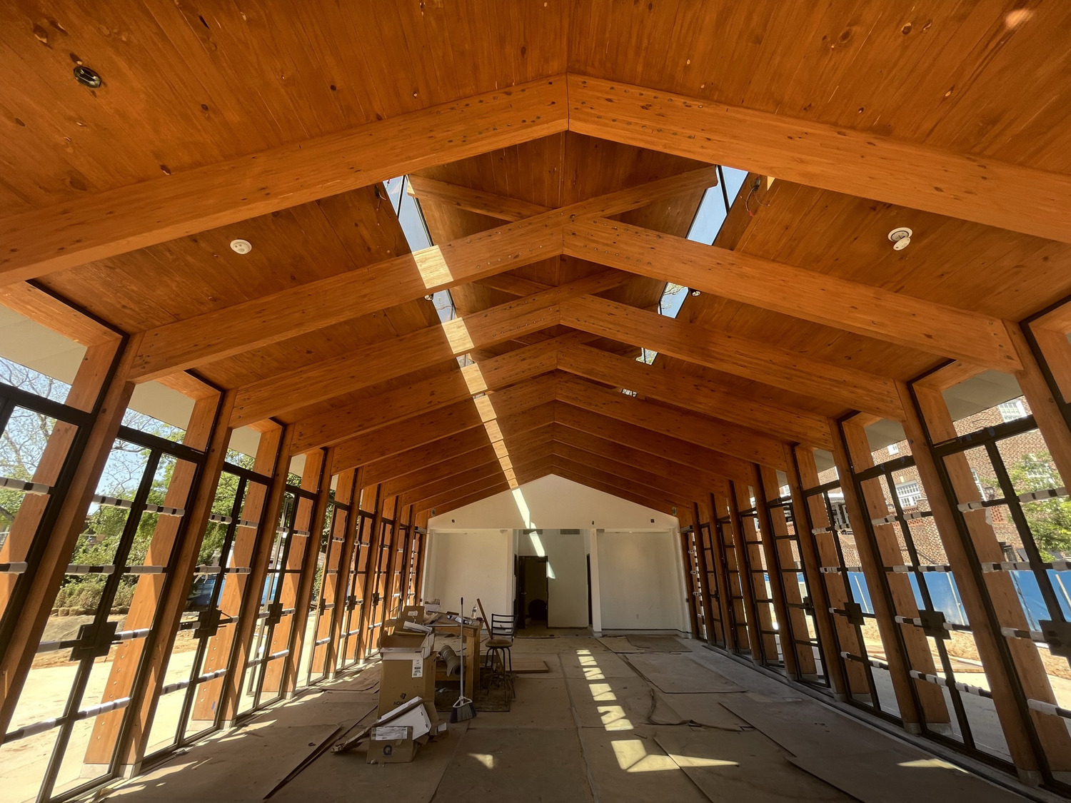 - Gathering House is an event space with expanses of glass-clad walls. The building features exposed engineered lumber framing and a cross-laminated timber roof.