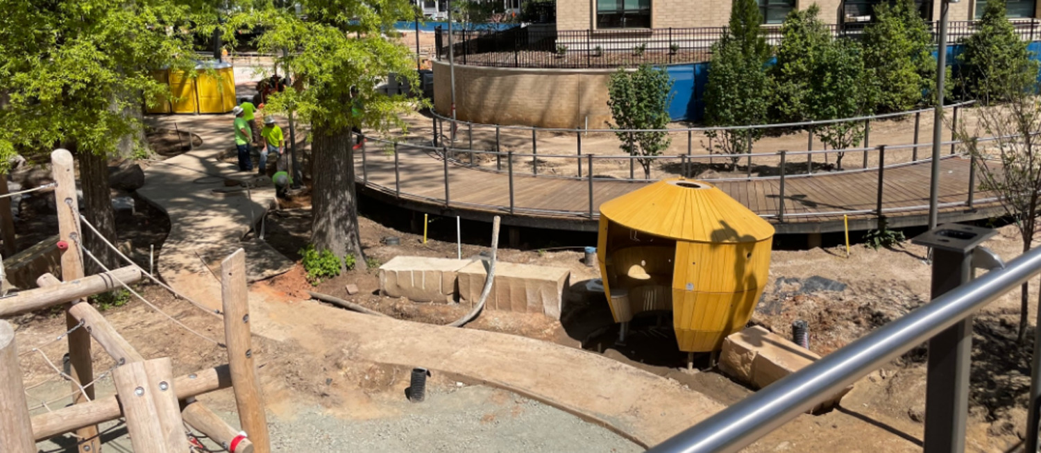 - Nest bridge. The steel-framed, elevated walkway spans over the children’s play area, providing access from the parking garage and library to Academy Plaza. The design incorporates the bridge with the play area in several ways. One branch of the bridge steps down and inconspicuously hides a pump room for the adjacent splash pads. A large bench accessed from the play area is suspended from the bridge structure above and single-column supports minimize interruption.