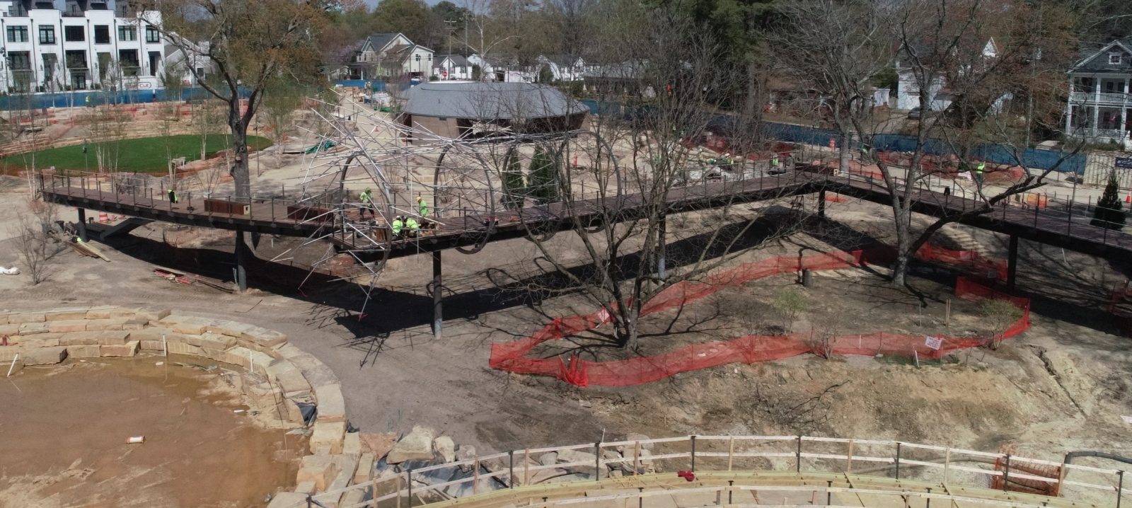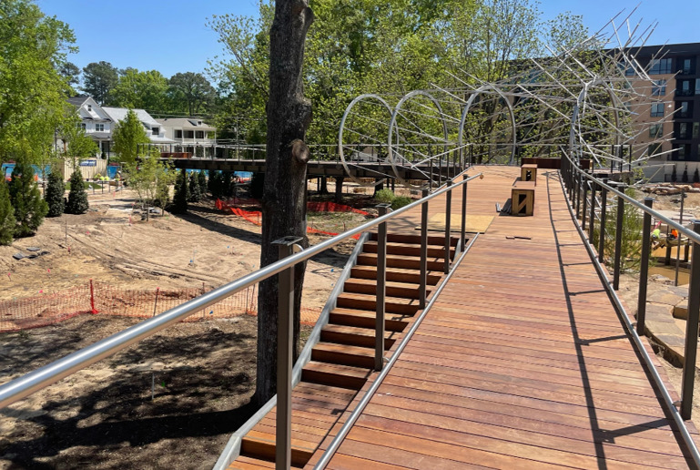 - Skywalk. Constructed similarly to the Nest bridge, the Skywalk is the park’s longest bridge. It weaves through champion trees, creating overlooks and offering visitors an elevated perspective of the tree canopies. The single-column design minimizes impact to the tree’s critical root zones. The Skywalk is accessible from Walker Street and touches down several times along its length via stair structures. An overlook at the middle pond supports Haddad Drugan’s Light Passage sculpture, featuring a series of steel rings around the walkway with an organic layout of branches.