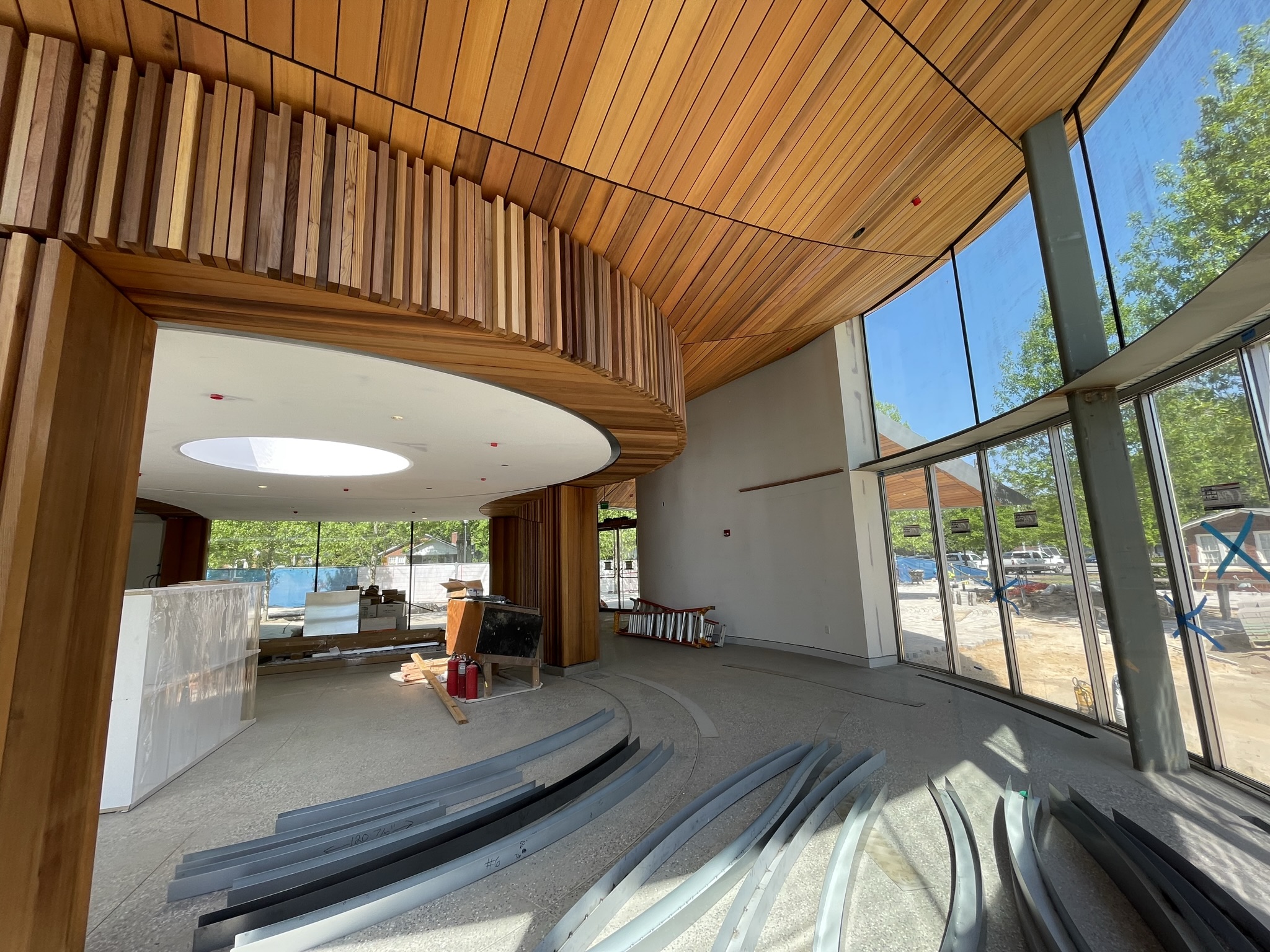 - Gathering House is an event space with expanses of glass-clad walls. The building features exposed engineered lumber framing and a cross-laminated timber roof.
