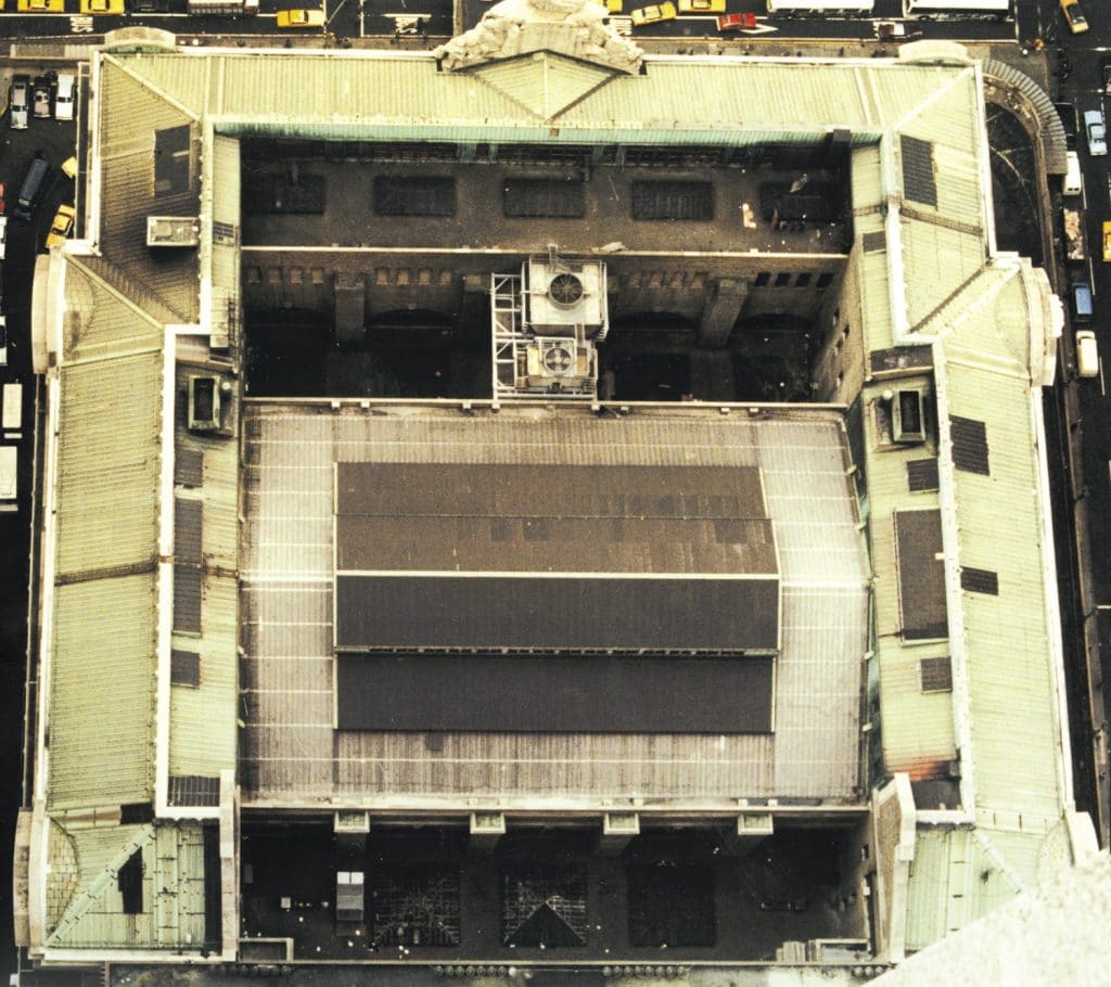 - Broken skylight glass and skylights that were still partially covered with “black-out” building paper, a relic of World War II air raid precautions