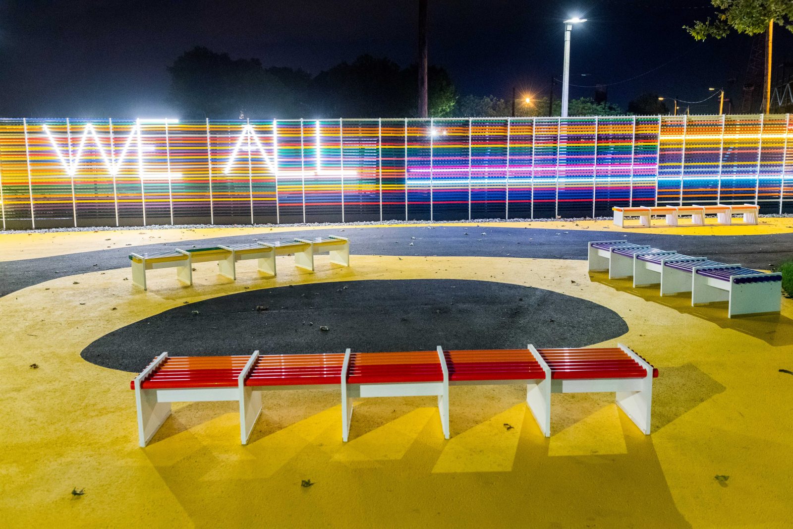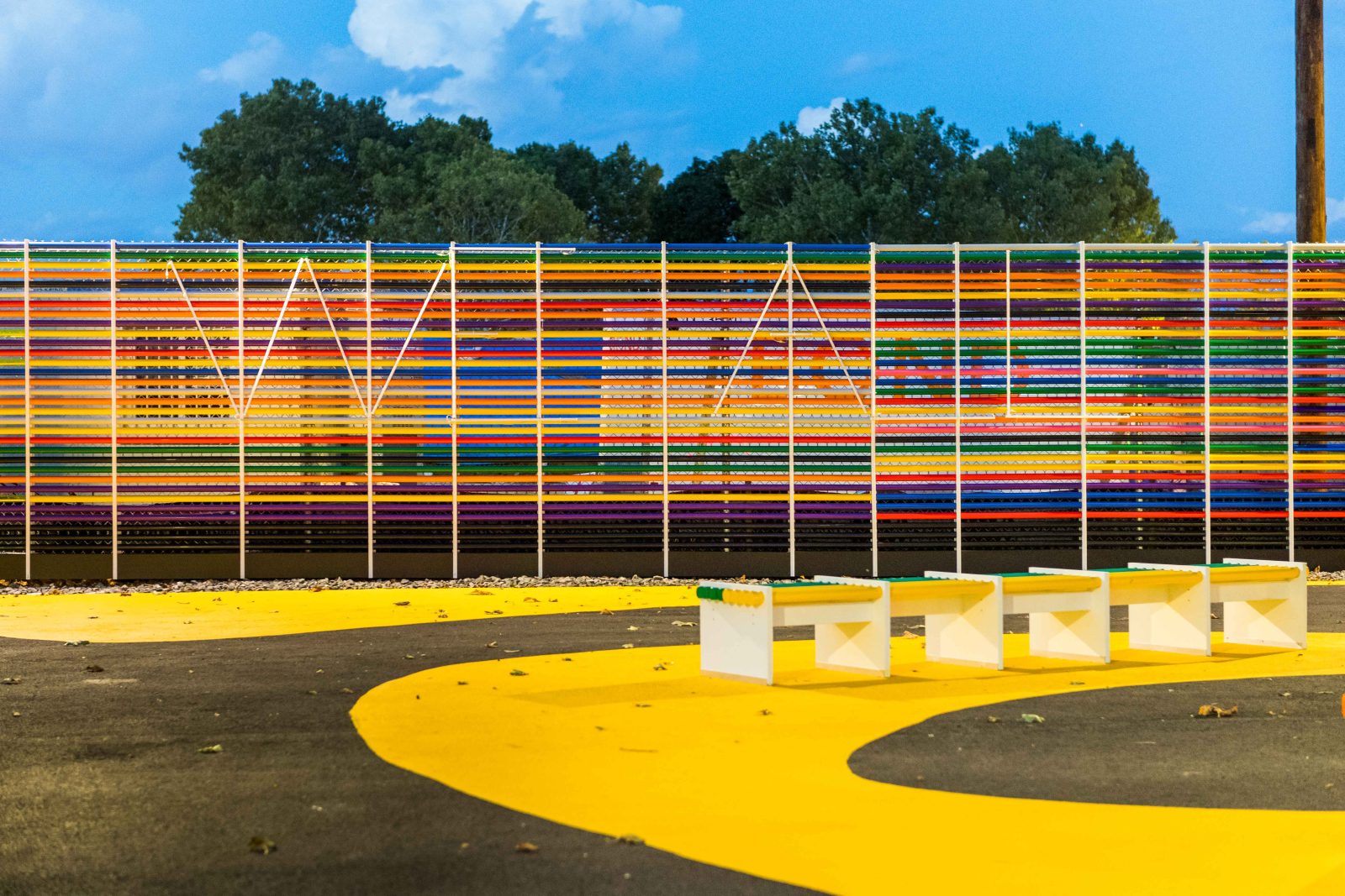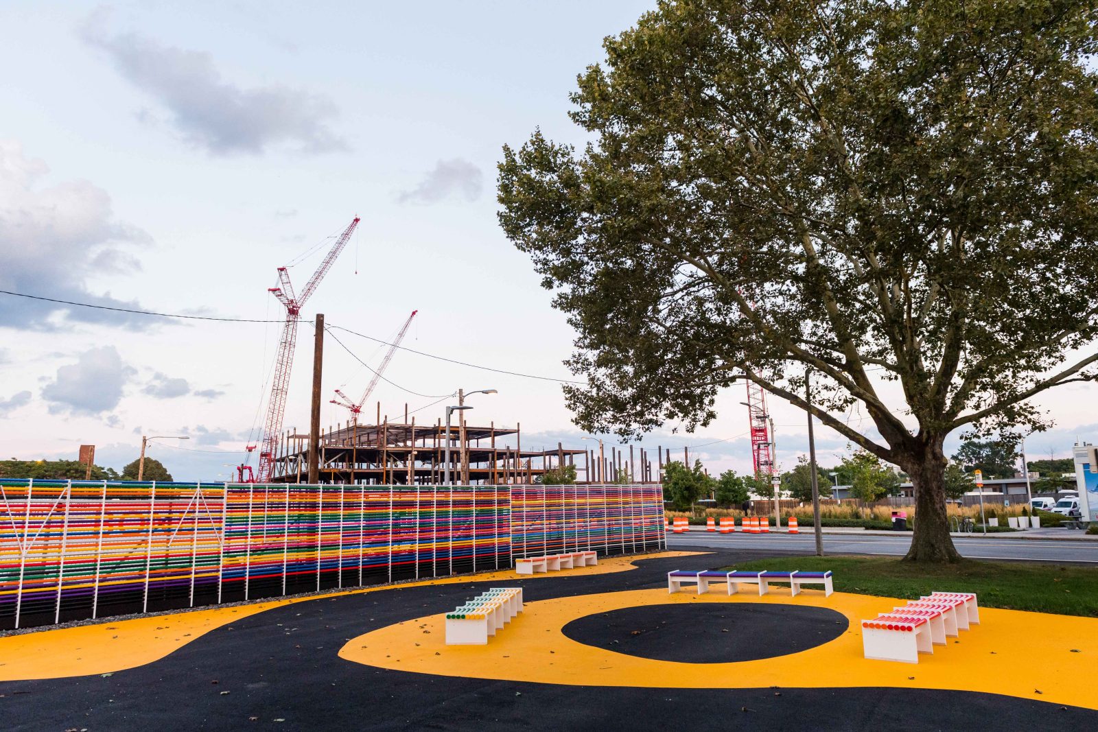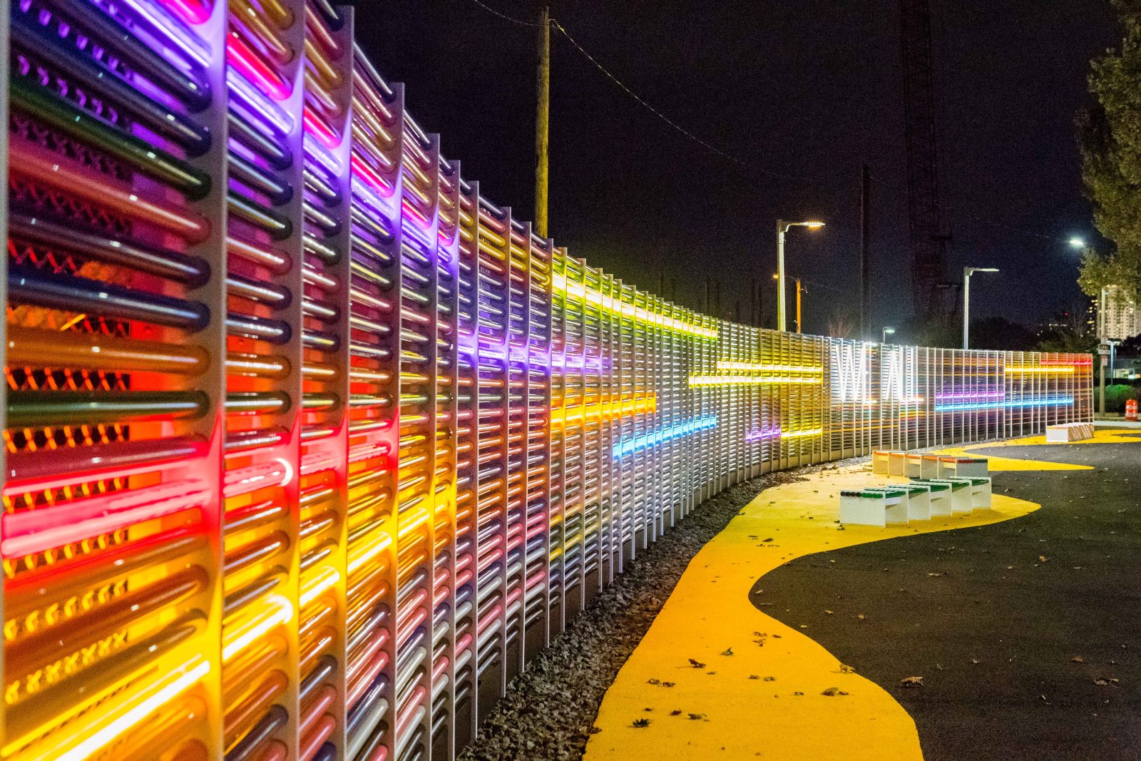 Along with other park improvements, We All is a vibrant wall comprised of colored PVC and transparent acrylic glass tubes displayed along an existing construction fence and illuminated at night. SGH consulted on the structural and material design for the fence display and new benches. Highlights of our work include the following: