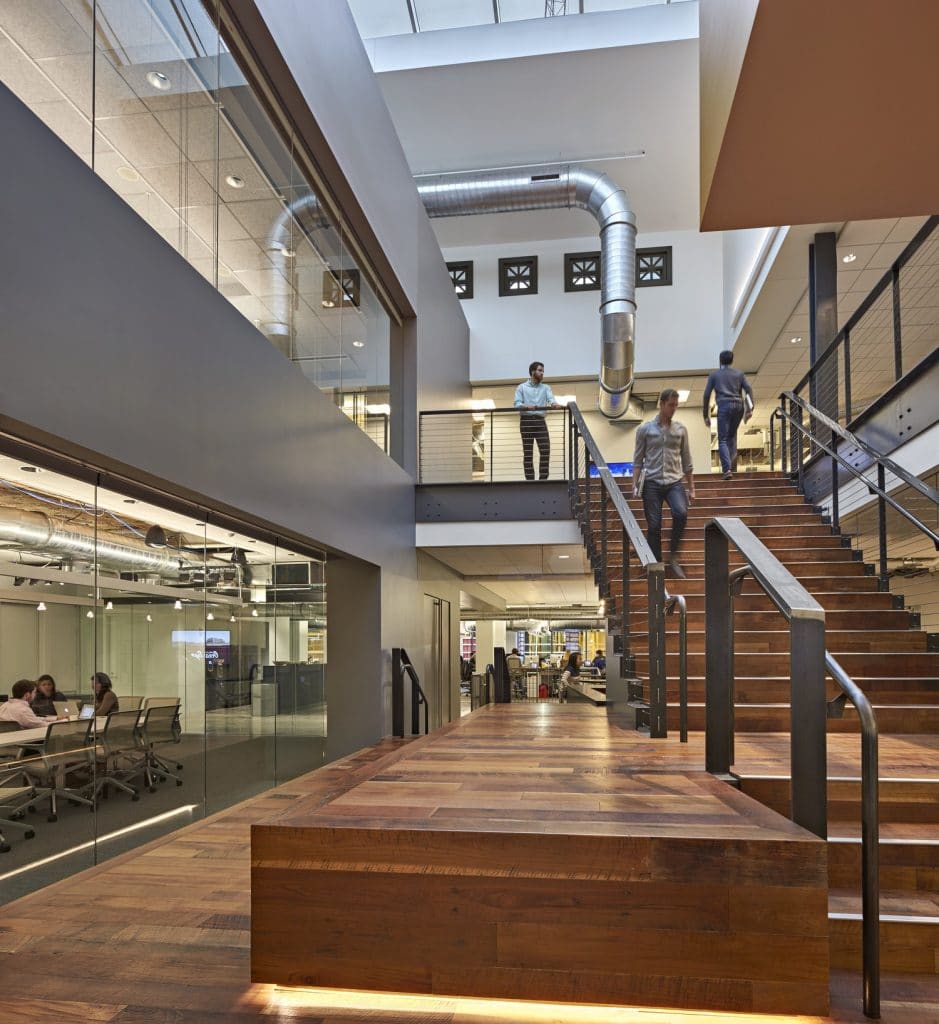 Designed by Sasaki for the new Boston-based headquarters of Havas/Arnold Worldwide, the interior fitout represents the edgy characteristics of the client while providing a welcoming and exciting workspace. The modern office space of the Havas Village Boston embraces its location in the recently-restored Burnham Building with exposed areas of the original terra-cotta flat slab construction and early steel-framed construction. SGH provided structural design services for the four-level interior fitout project.