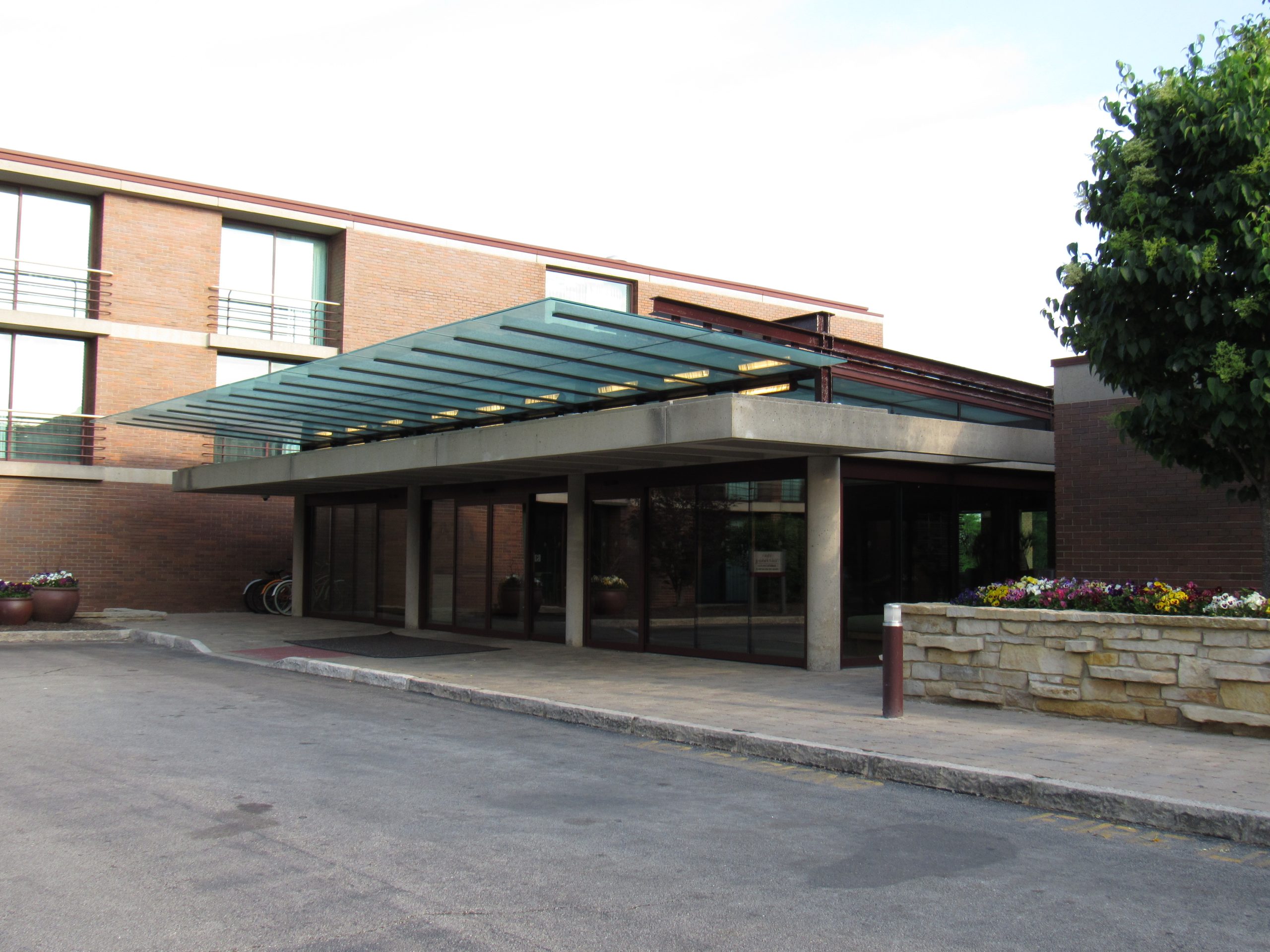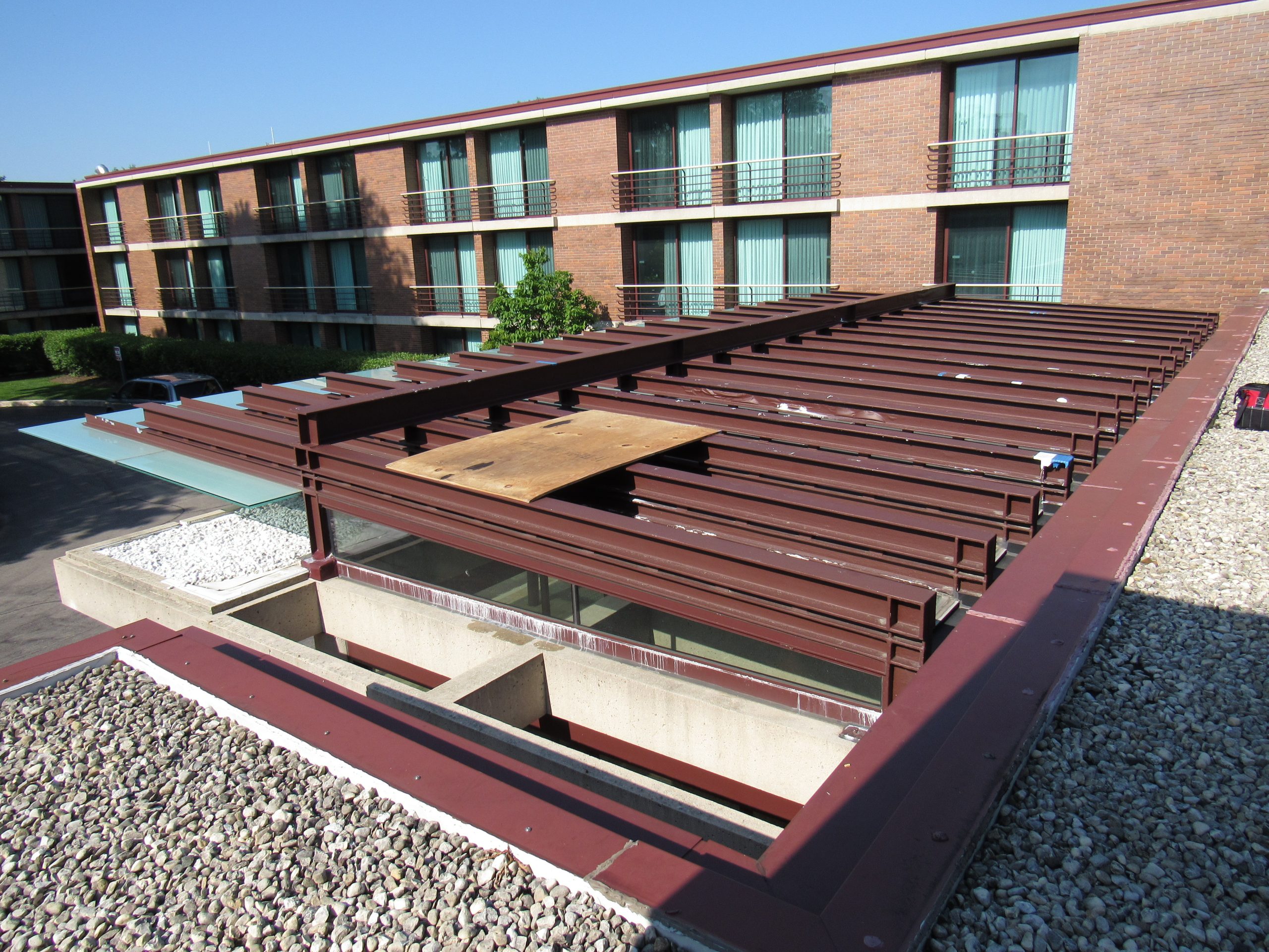 Hyatt Lodge at McDonald’s Campus added a new entrance vestibule in 2012, enclosing the original open-air, concrete-framed structure with a new exposed galvanized steel canopy structure featuring fixed glazing, sliding glass doors, and glass skylights. To meet building code requirements, the steel structure was coated with a three-part fireproofing coating featuring a primer, an intumescent layer, and protective top coat. Hotel personnel observed the protective coating peeling, the intumescent material activating, and water leaking into the vestibule. SGH investigated the cause of the intumescent failure, developed repair documents, and oversaw the repairs.
