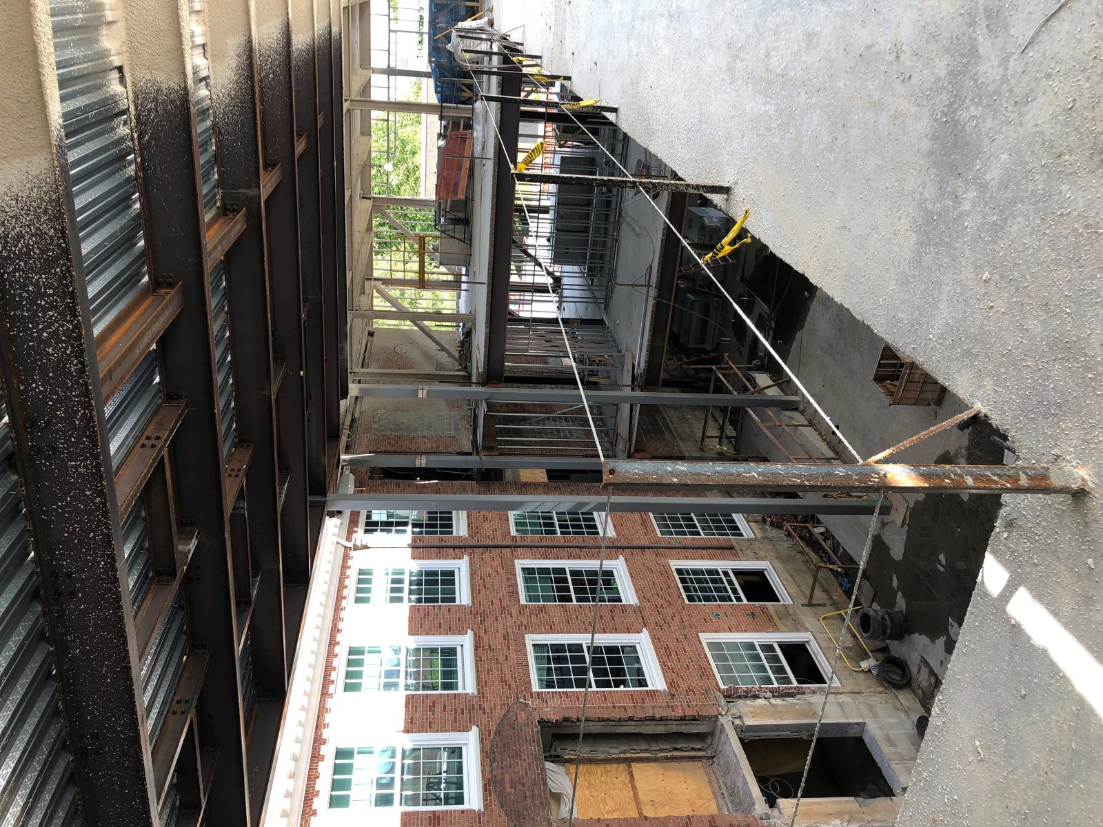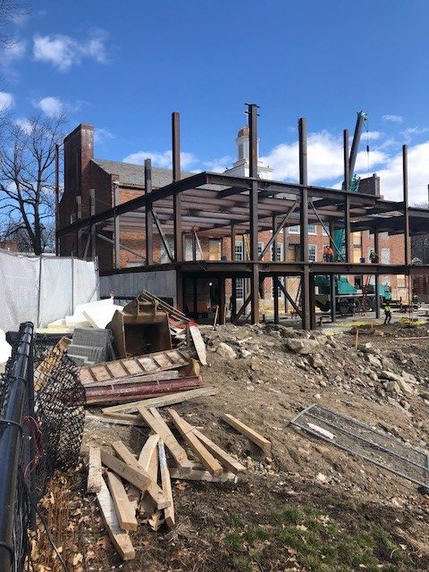 - Framing for the three-story atrium that showcases the existing building and the new addition in one dramatic space