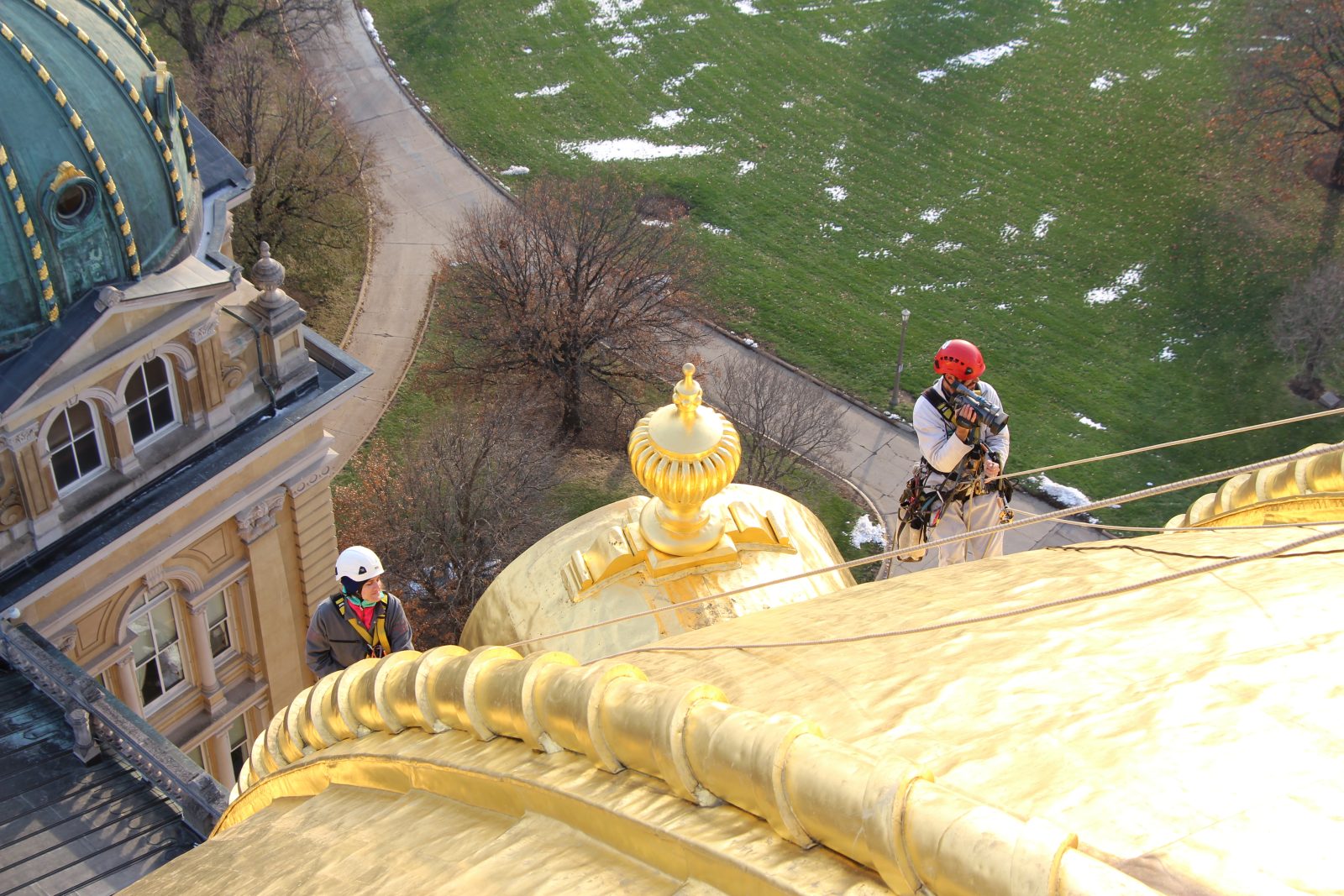 - Used industrial rope access to evaluate the condition of the dome roofing and masonry exterior, viewed upper portions of the lantern with pole-mounted video equipment, and reviewed interior spaces via existing access ladders and stairs