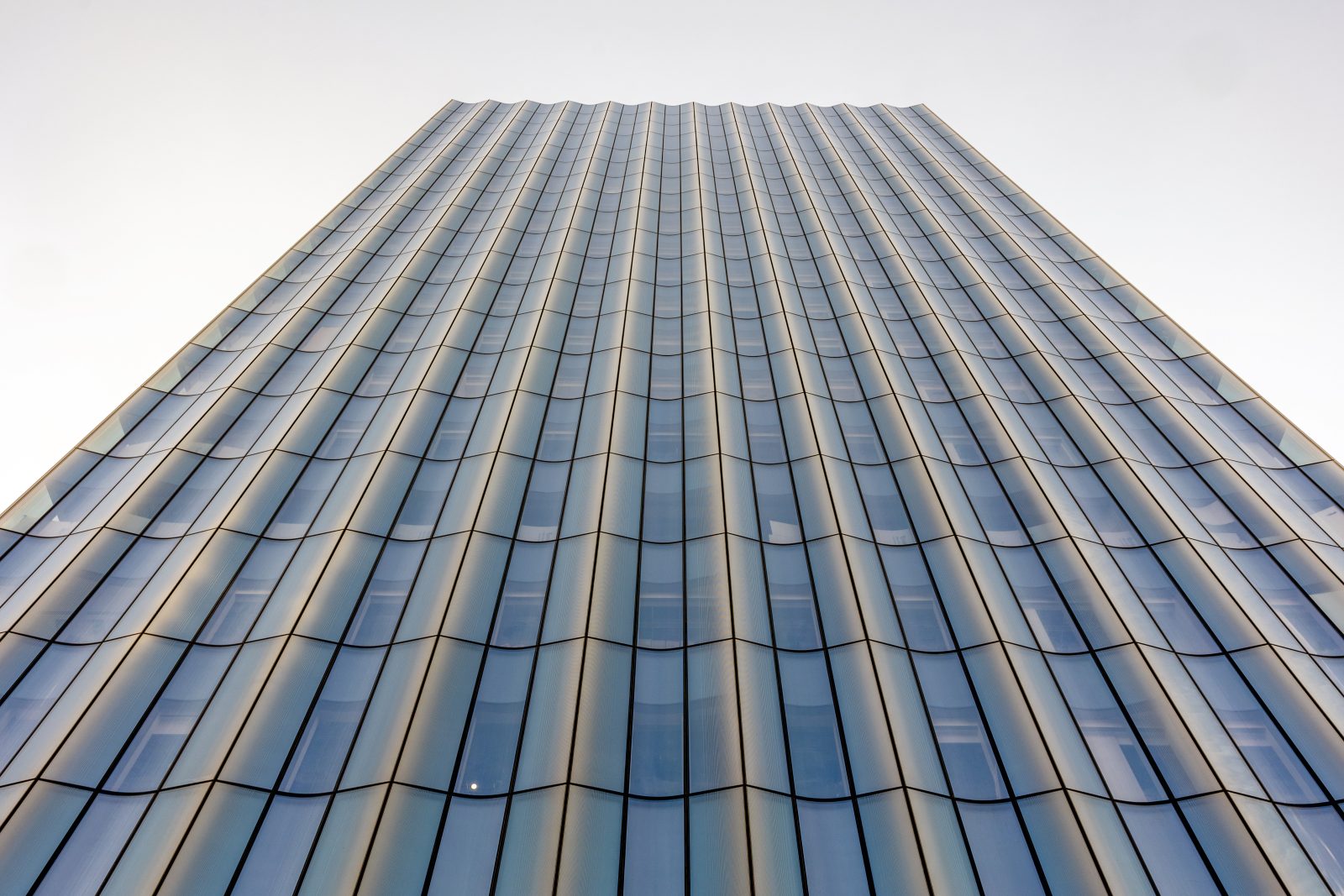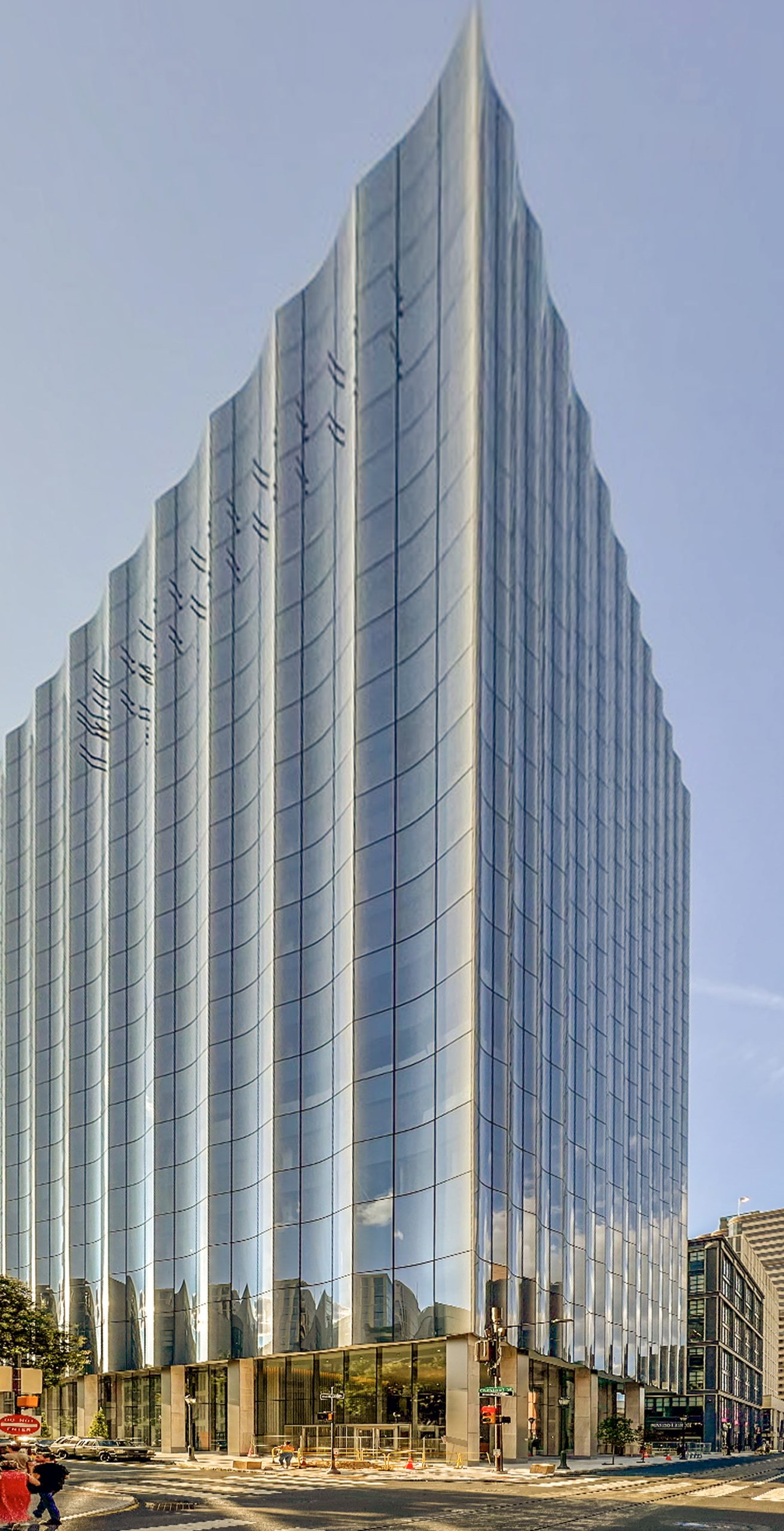 • The main tower with pleated appearance created by curved insulated glass units set between angled flat glass curtain wall units