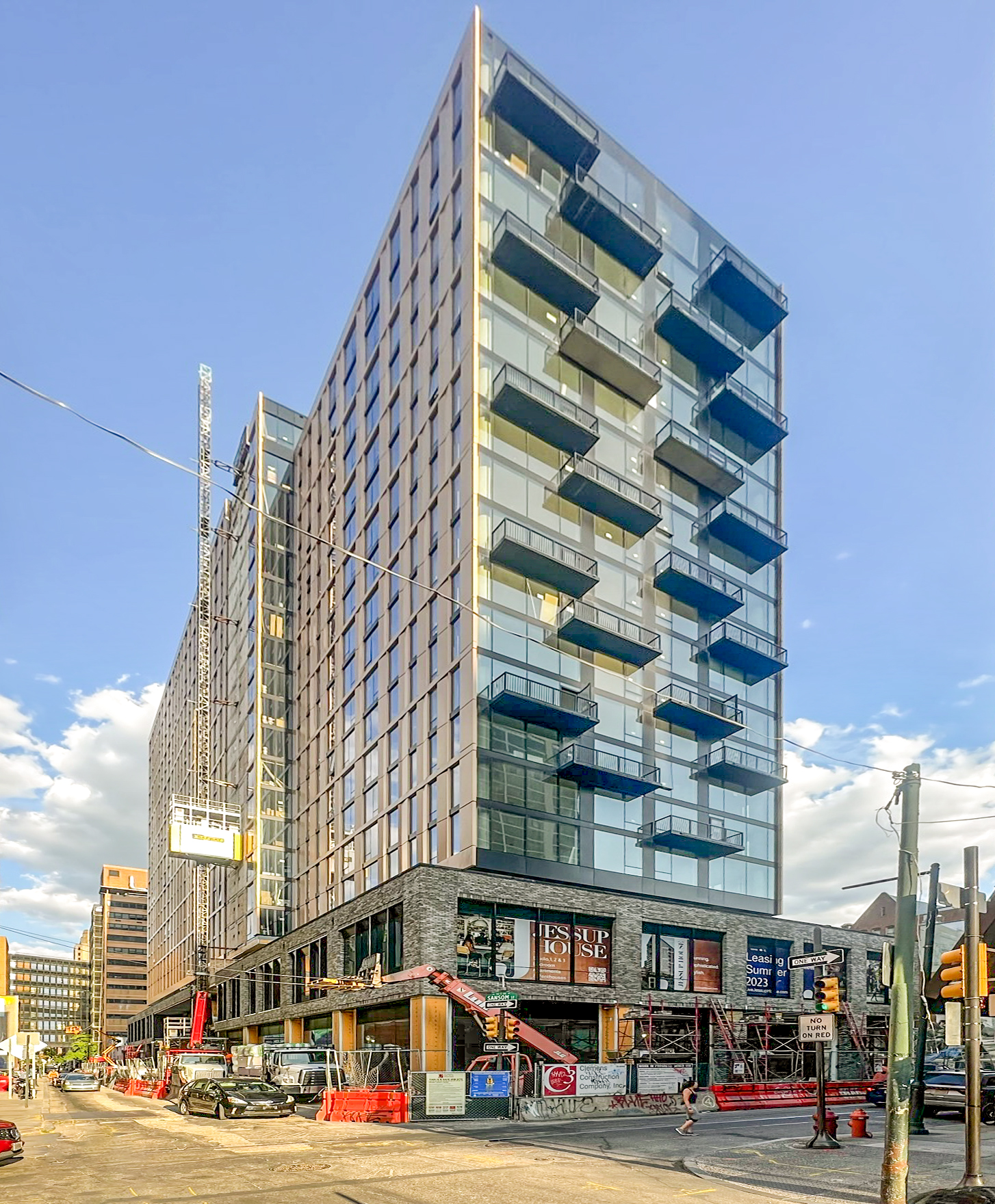 Located at 12th and Sansom Streets in Philadelphia’s Washington Square West neighborhood, Jessup House is a twenty-story, mixed-use, multifamily development. Housing almost 400 residential units, the tower is constructed on a multistory podium with below-grade parking and ground-level commercial space. The gray brick-clad podium helps bring the high-rise development down to street scale by providing some visual separation from the tower primarily clad with unitized window wall assemblies and copper-colored metal panels. SGH consulted on the building enclosure design developed by Perkins Eastman and provided engineering support during construction.