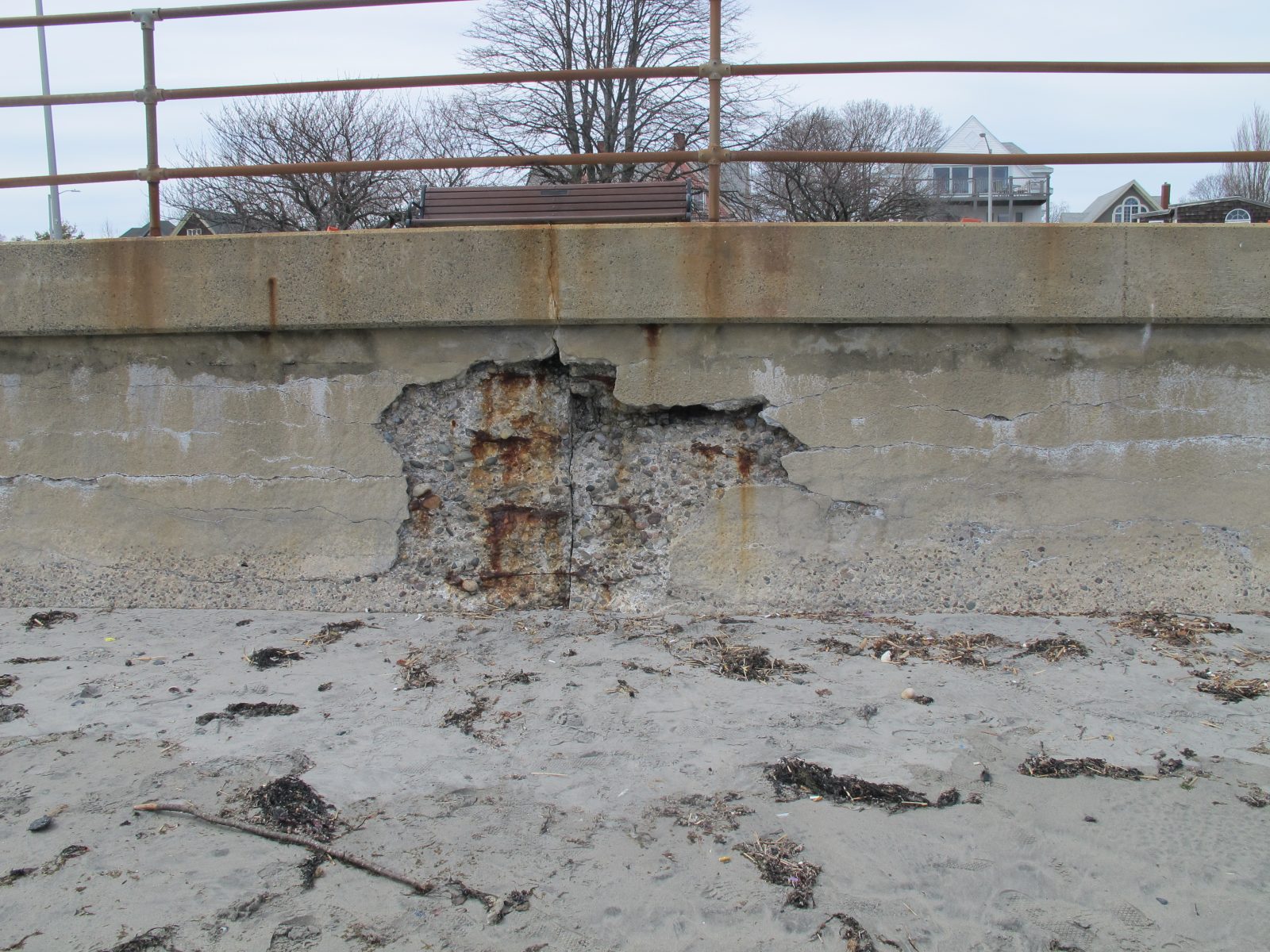 The King’s Beach seawall runs between the Town of Swampscott and the City of Lynn. The seawall was originally constructed in the early 1900s and has been repaired and modified many times. The portion of the seawall in Swampscott ranges from approximately 4 to 15 ft tall and was visibly deteriorated. SGH evaluated the condition of the seawall and developed a repair solution and construction documents.