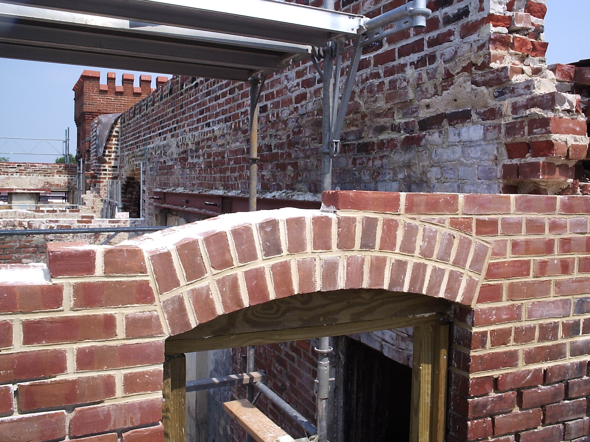 The armory was constructed as a load-bearing brick masonry structure with wood floor and roof framing. The ornate exterior walls, which feature terra-cotta crenellations and a decorative band course, were relatively sound and able to be rehabilitated, but wood elements were largely destroyed.
