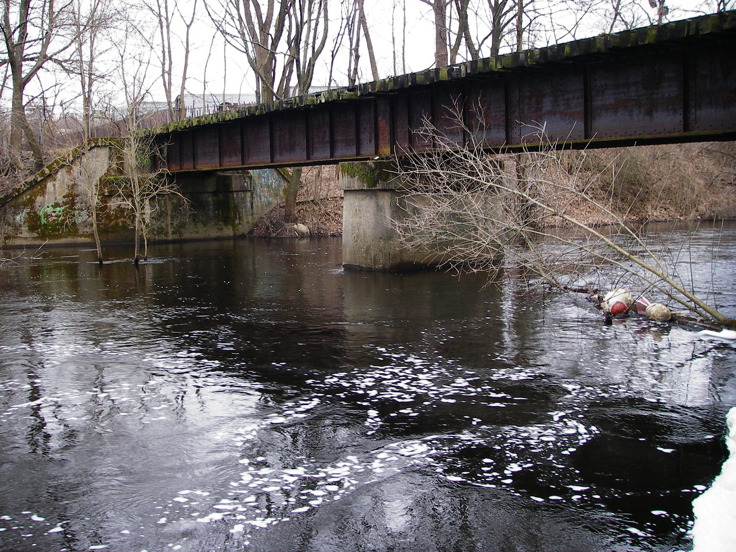 SGH evaluated the condition of the two-span superstructure comprising two riveted steel built-up plate girders, steel cross bracing between girders, and timber railroad ties laid across the tops of the girders. The substructures consist of two reinforced concrete abutments, one on each bank, and a reinforced concrete pier in the center of the river. Our subconsultant performed an underwater inspection to verify that there were no indications of scour or substructure damage.
