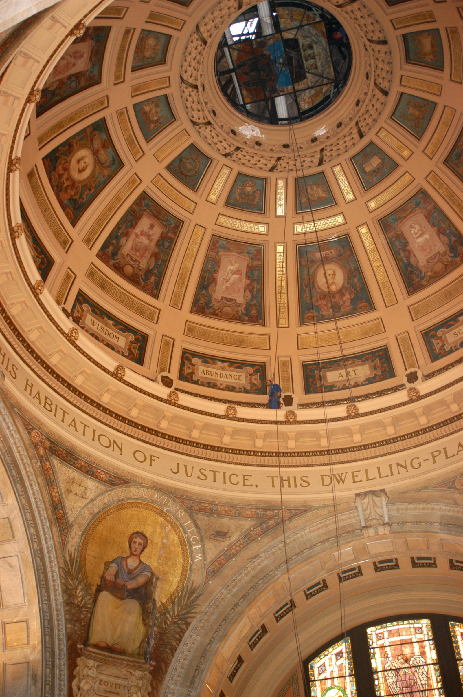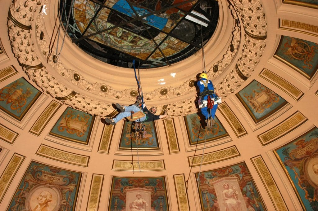 SGH used industrial rope access inside the multi-story rotunda to perform a hands-on condition assessment of the plaster-clad dome featuring mosaics and frescoes depicting the county’s history. We also performed an exterior condition assessment using a mechanical lift and binoculars. SGH designed a comprehensive exterior rehabilitation, including the following: