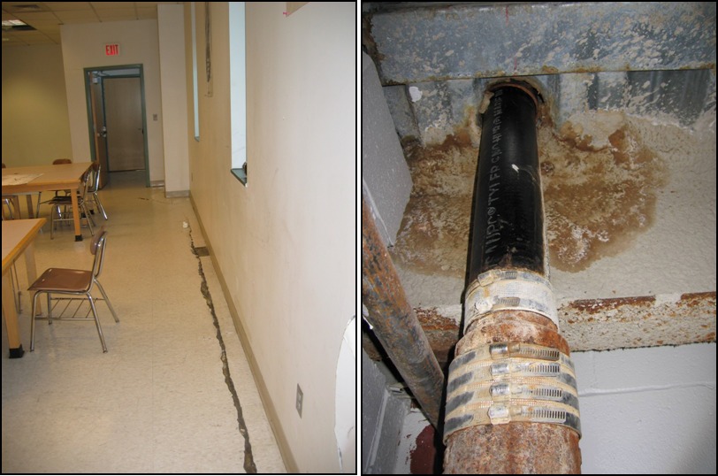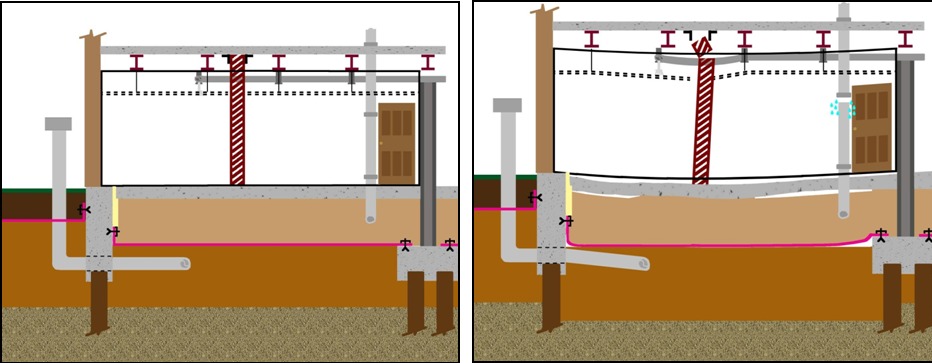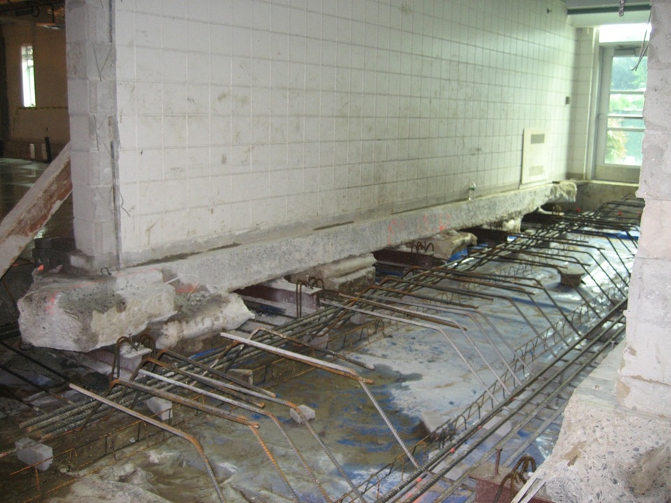 Structural Phase. SGH investigated the causes of ongoing settlement of the slab-on-grade. In the first six years after construction, the slab settled up to 7 in. due to secondary consolidation of the construction debris stratum. The settlement resulted in significant damage to the first story, including a partially collapsed interior masonry wall, cracked and uneven slabs, broken utility lines, jammed doors, and malfunctioning mechanical and utility systems.