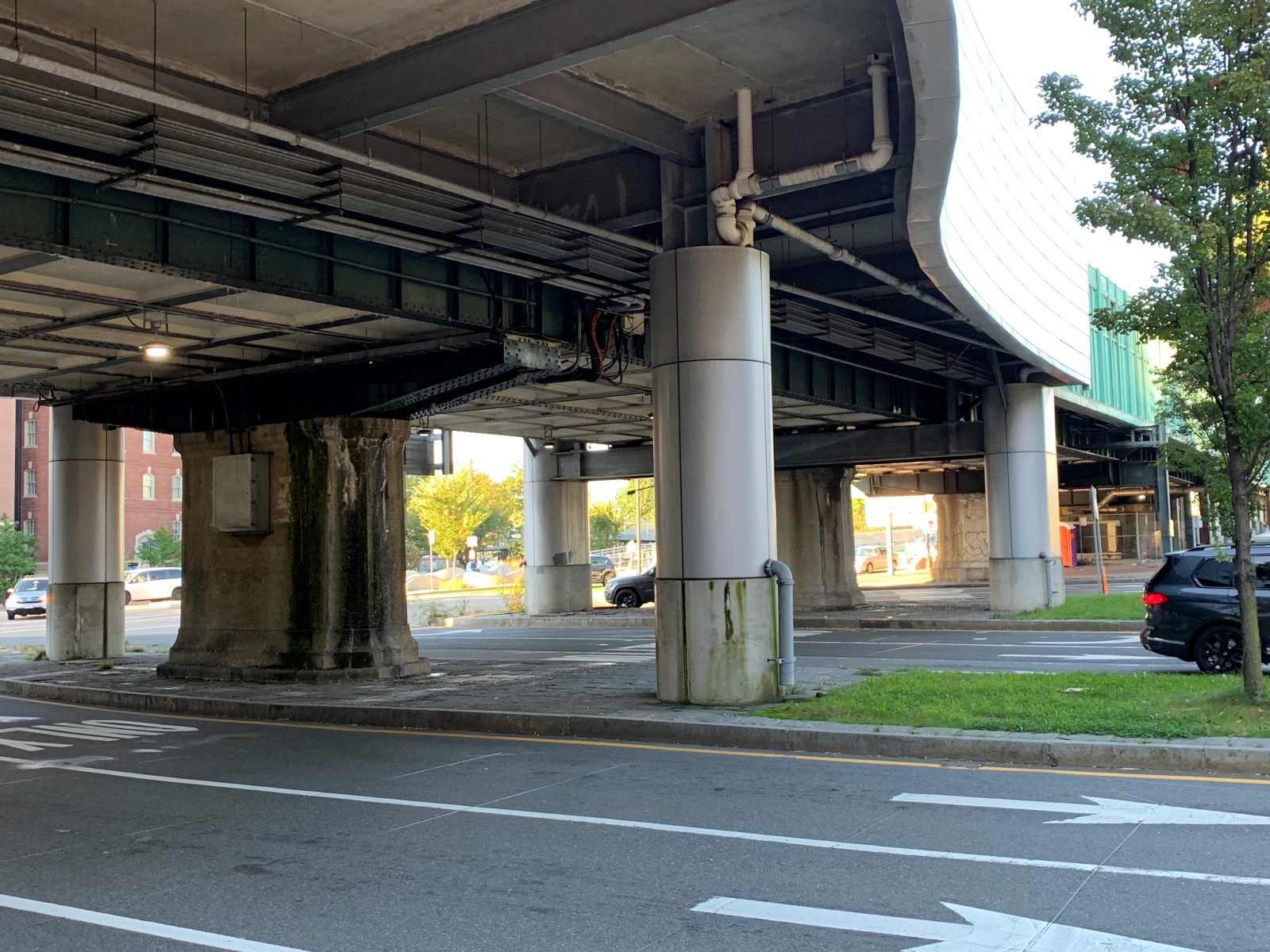 The existing pier supporting the viaduct had a reinforced concrete stem supporting a steel-hammerhead cap beam.  The new supports consisted of steel moment frames integrated into the architecture of the new station.