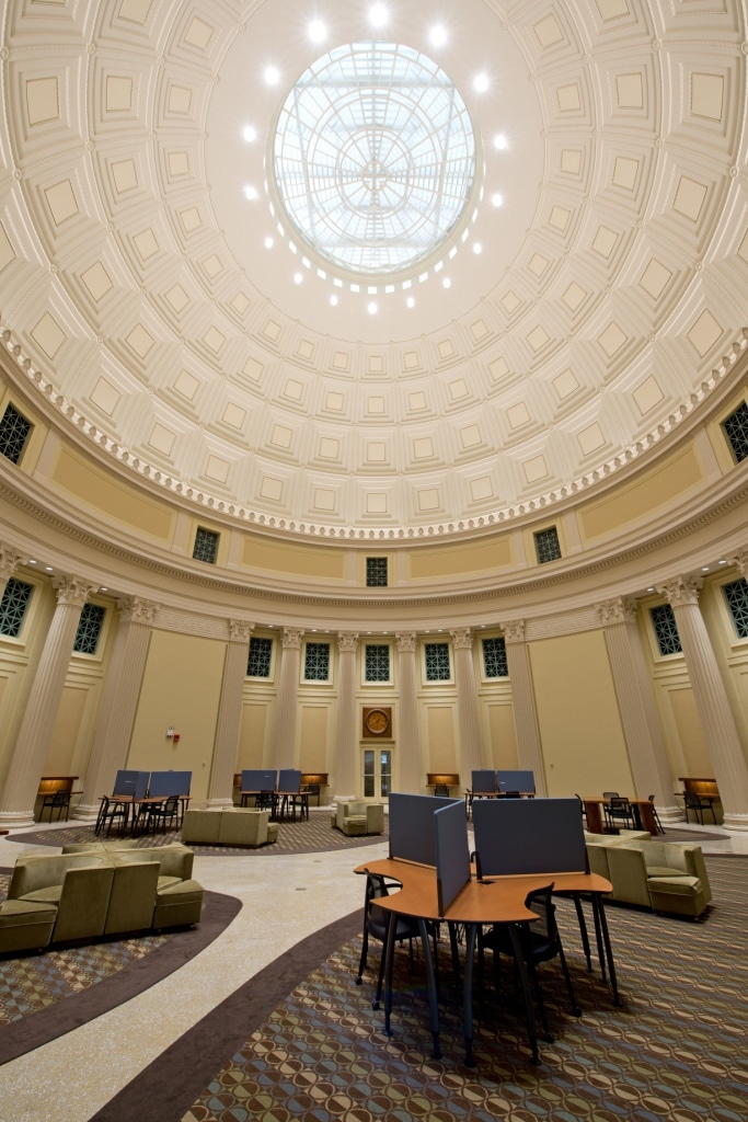 MIT’s Main Group Buildings, dedicated in 1916, include Building 10 with its prominent limestone- and copper-clad Great Dome. SGH investigated leakage into the Barker Library below the Great Dome and developed a durable repair solution commiserate with the original design aesthetic. We also led a multidisciplinary team for the restoration of the oculus skylight and the Barker Reading Room.