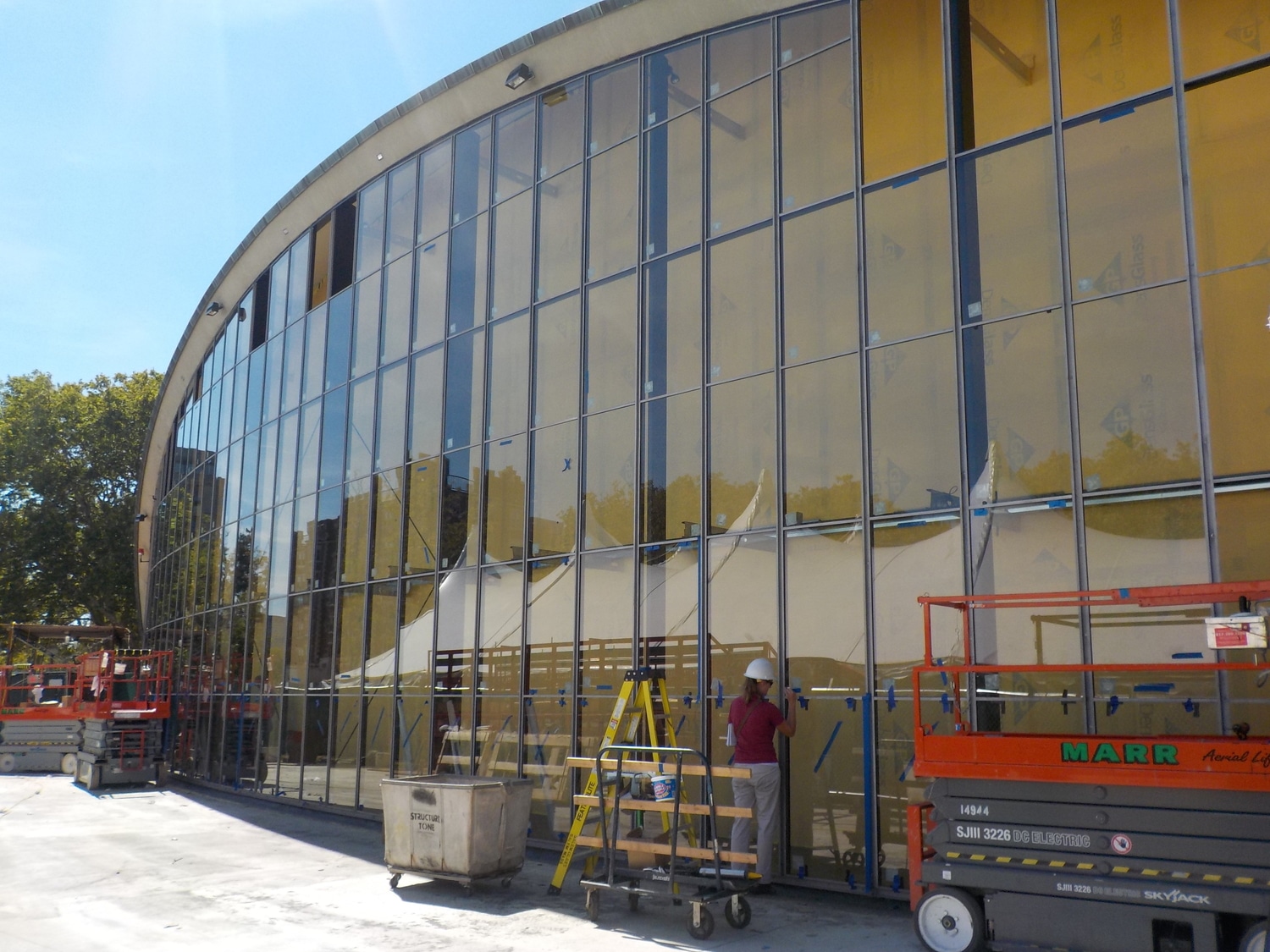 SGH developed a structural and building enclosure rehabilitation design for the curtain wall to improve life safety, durability, and energy efficiency, while being true to the original design. We designed replacement curtain wall framing members to support heavier glass lites while maintaining the original profiles and without compromising sight lines. We achieved this by supporting the new curtain wall and heavier glass directly on the building foundation and reducing gravity loads on the existing interior structural steel framing, so it only needed to support wind loads. Our rehabilitation plan also included retaining and restoring the original interior steel members originally supporting the curtain wall framing, replacing curtain wall glazing with heat-strengthened laminated glass with a low-emissivity coating to improve safety and thermal performance, and repairing the curved concrete edge beams of the thin shell concrete roof.