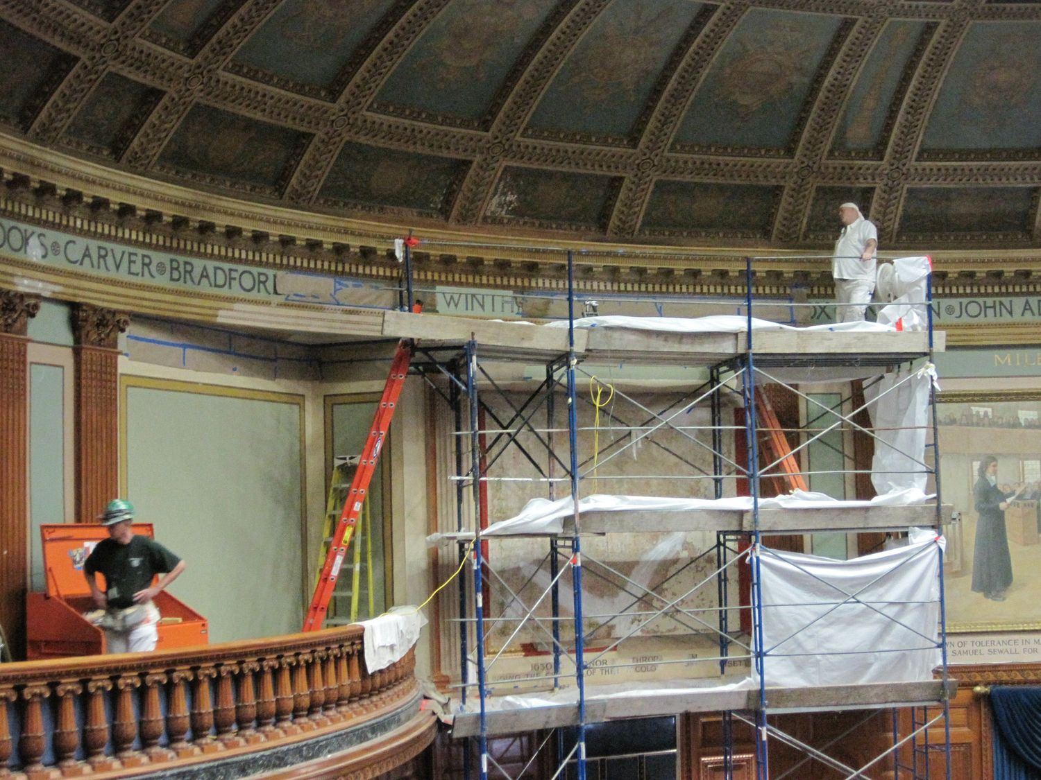 SGH investigated leakage at the Annex copper roofs that damaged decorative plaster finishes and historic murals. We concluded the copper roofing and underlayment could not accommodate expansion, which lead to leakage. SGH designed temporary roofing to stop chronic leakage and then designed repairs and provided construction administration services for a comprehensive roof replacement and repairs to interior finishes, including decorative finishes. We developed repairs that extended the useful life of the structure and were also commensurate with the historic composition of the building. Our rehabilitation program included the following work, which was reviewed by the Massachusetts Historical Commission: