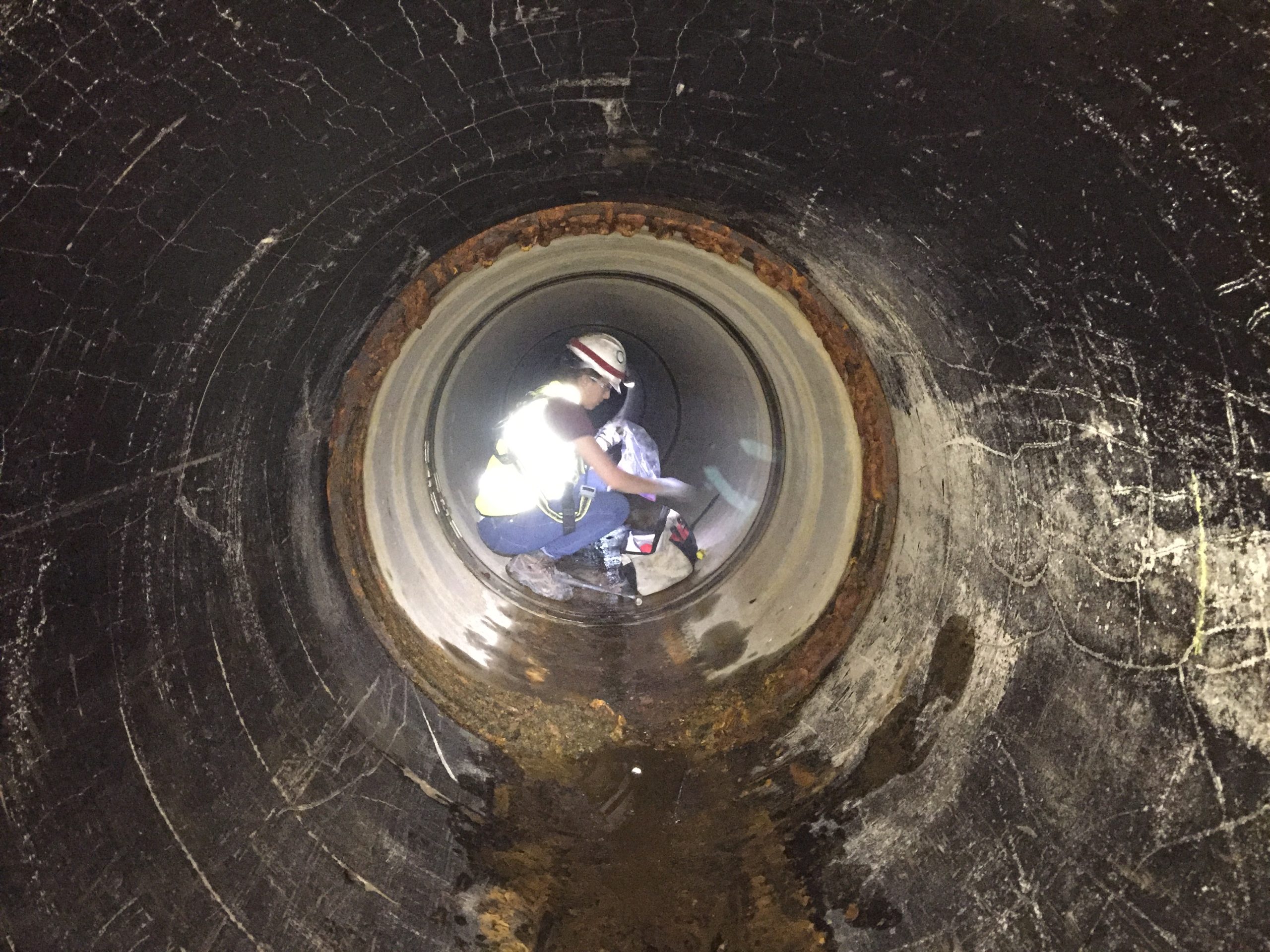 MWRA selected internal repairs with a carbon fiber-reinforced polymer (CFRP) liner, which would allow them to avoid excavating and disrupting train operations. The cast iron pipe had only 4 ft of soil between it and the train tracks above. After determining workers could safely enter the pipe to execute repairs, we designed a CFRP liner for a 72 ft long portion of the pipe.