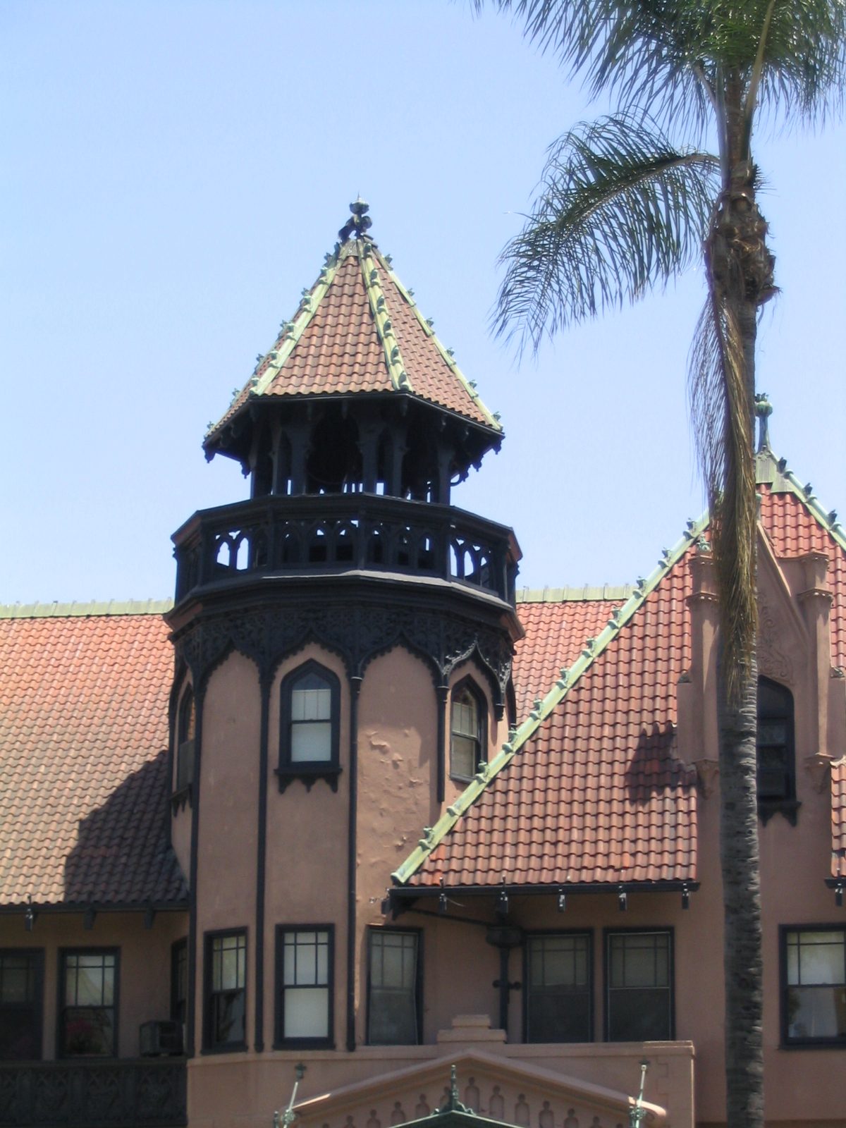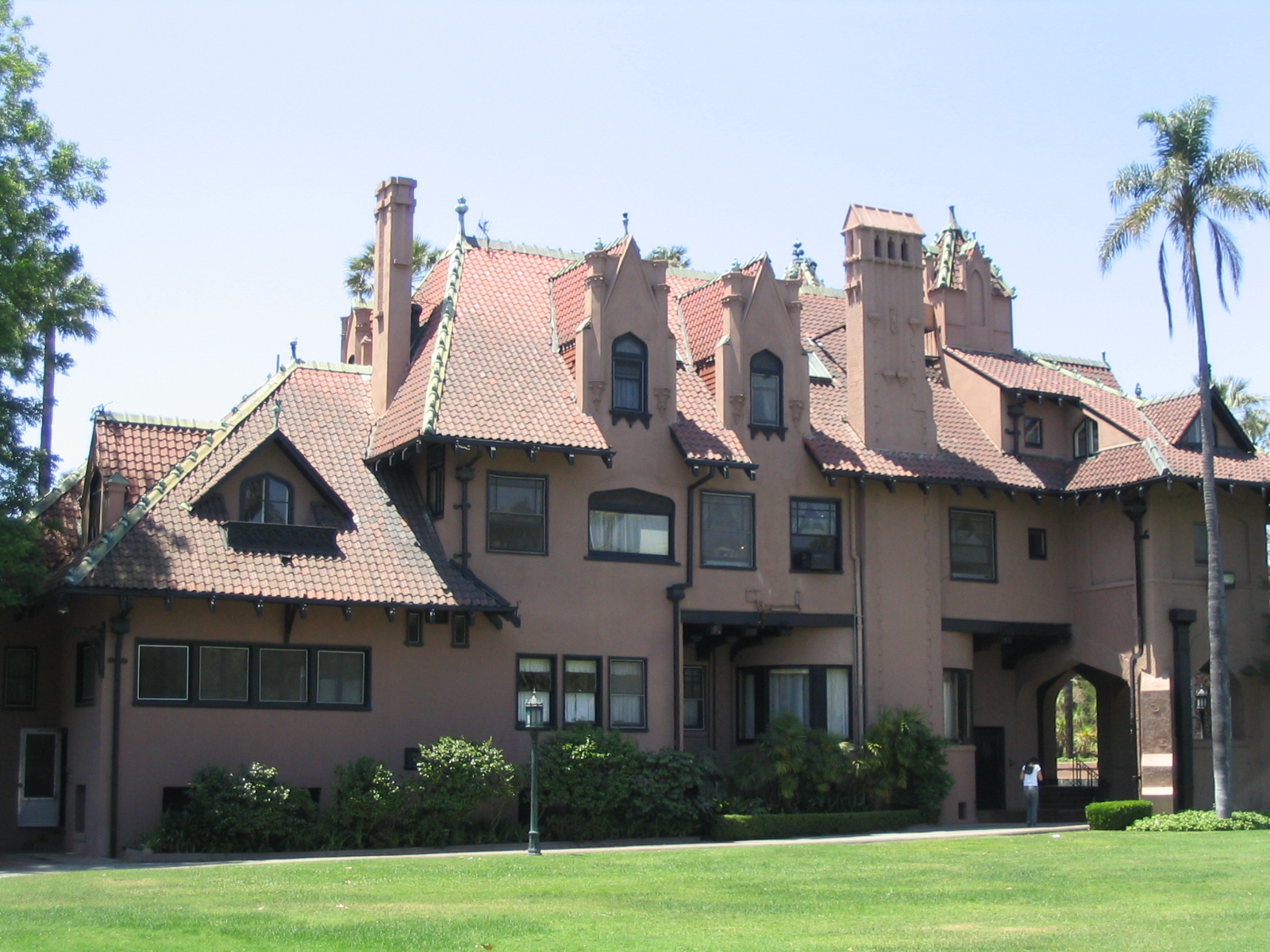 - Prominent features of the Doheny Mansion are a Tiffany glass dome, numerous wood balconies, and a wooden tower above the main entrance